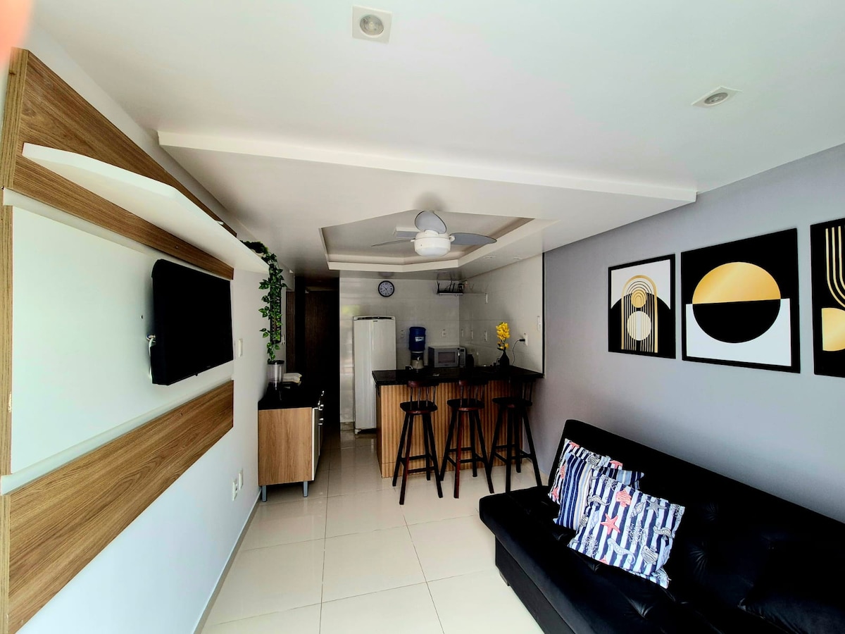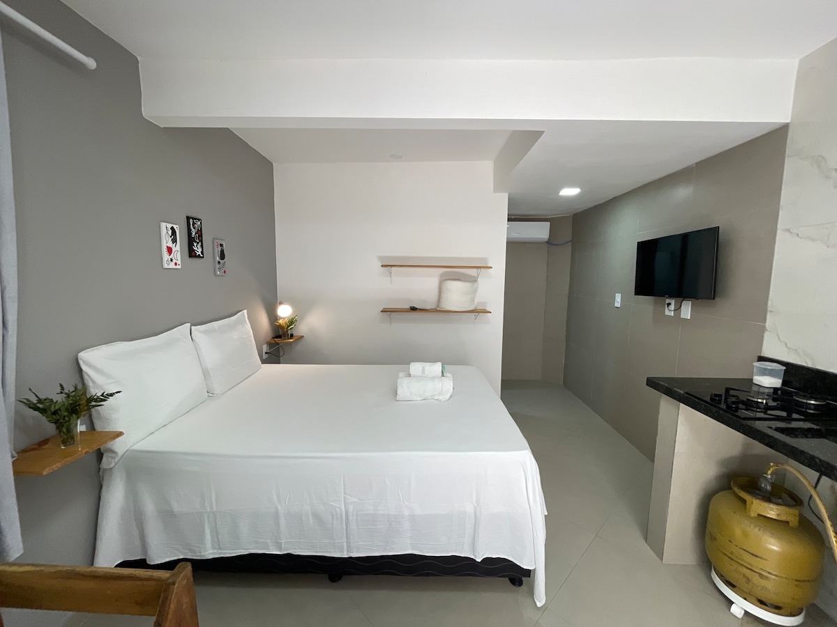 Lindo e confortável apartamento com suíte, sala/cozinha americana, estacionamento privativo para 1 veículo, localizado em condomínio fechado e bem perto da praia (50 metros). A suíte possui: TV 42" e ar condicionado split. Na cozinha: fogão, geladeira, microondas, sanduicheira, liquidificador e cafeteira. Na sala: um sofá cama. O Condomínio: em uso coletivo os hospedes poderão desfrutar de piscina, salão de festas, sistemas de câmeras, wi-fi nas áreas externas e apoio de um caseiro.