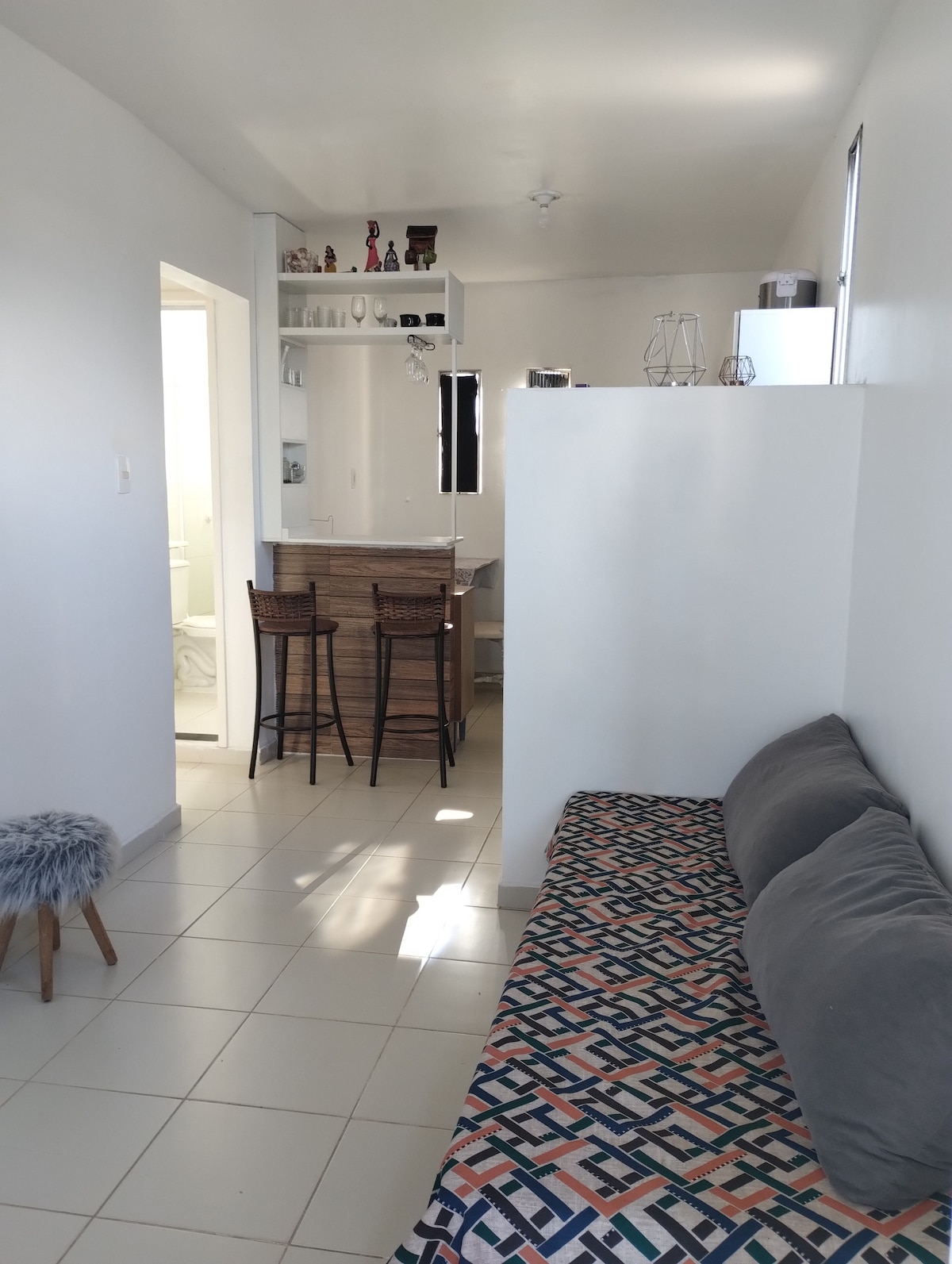 Apartamento aconchegante em condomínio familiar. São 2/4, sendo uma suíte, para acomodar a sua família. Um dos quartos com ar condicionado e outro com ventilador de teto com controle remoto. Na sala temos um ventilador de teto, sofá cama, mesa, TV Smart, WiFi, liquidificador, panelas, água, cafeteira elétrica, sanduicheira, talheres, xícaras, utensílios de cozinha, roupas de cama e banho. pano de prato, toalhas de rosto. Material de limpeza, esponja de prato nova, 2 sabonetes novos. 2 banheiros.