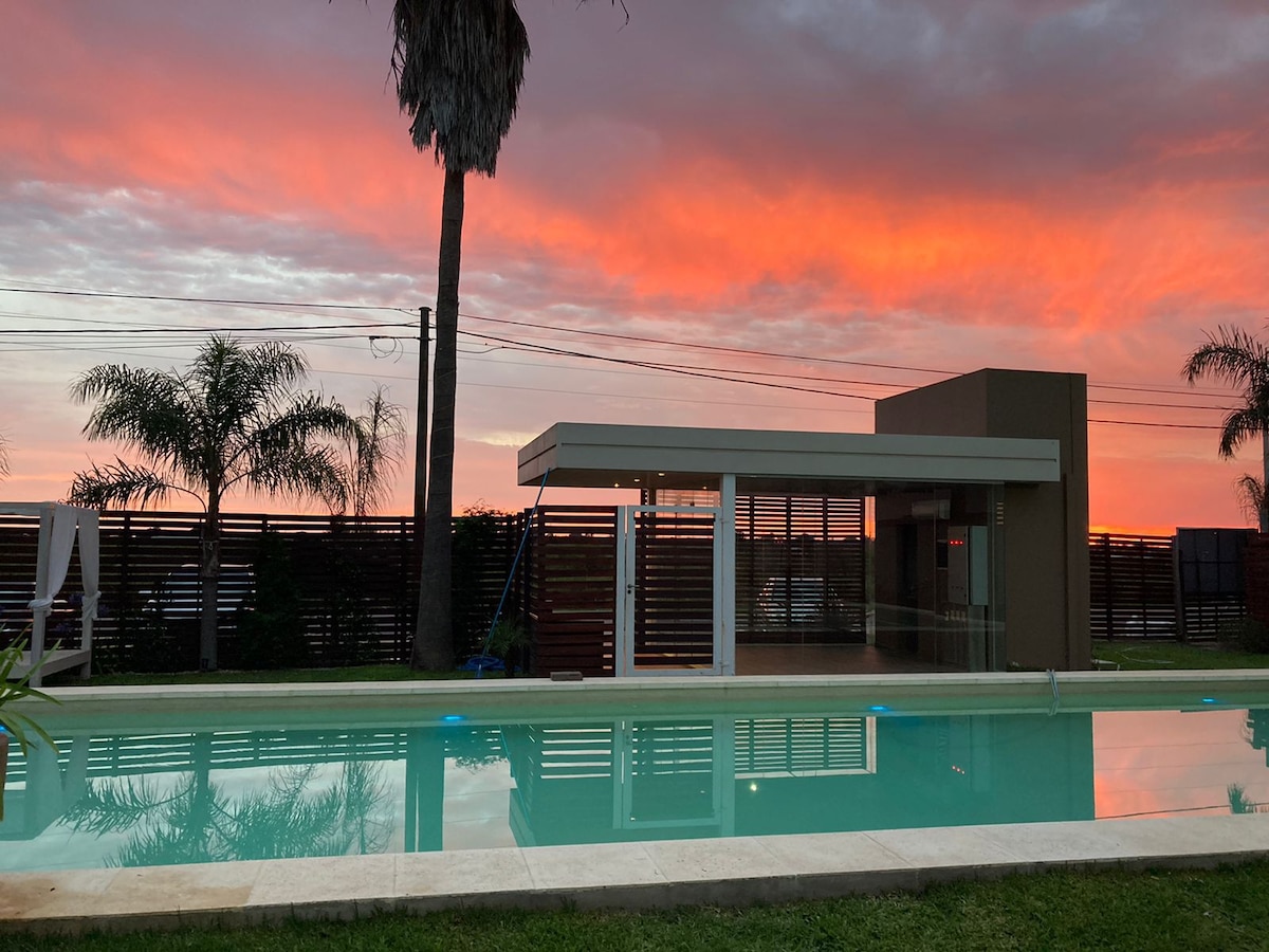 Hospédate en un agradable alojamiento dentro de un condominio, con amplio parque y piscina, a pocos minutos de las termas de Gualeguaychú y de las playas sobre el río Uruguay. Disfruta del quincho con parrilla disponible en el espacio común, y siéntete tranquilo alojándote en un barrio seguro, disfrutando de actividades al aire libre. A pocos metros, cuentas con un pequeño supermercado que abre 24 horas, y a unas cuadras dispones de una rotisería con un amplio menú a precios muy accesibles.