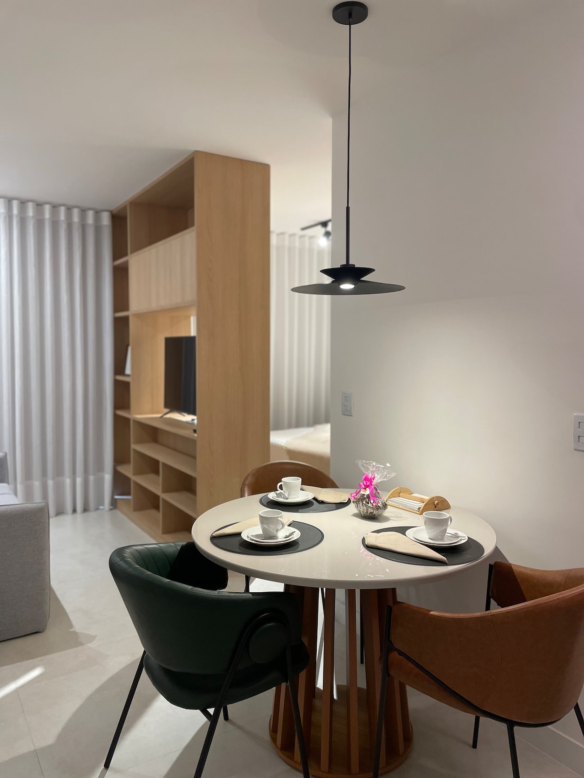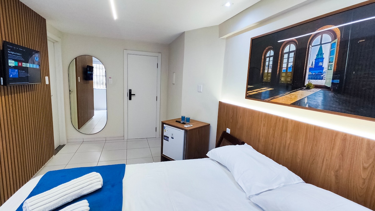 Desfrute de uma experiência premium com vista panorâmica de Belém. O Studio se destaca pela funcionalidade: a divisória com porta separa o quarto do estar, oferecendo privacidade superior. Relaxe na cama de casal ou no sofá-cama confortável (ideal para o 3º hóspede). O entretenimento é garantido na Smart TV 65", que inclui Netflix Premium no plano. A cozinha é completa e o Studio oferece chuveiro elétrico, secador de cabelo e ferro. Sua tranquilidade é completa com a garagem coberta exclusiva.