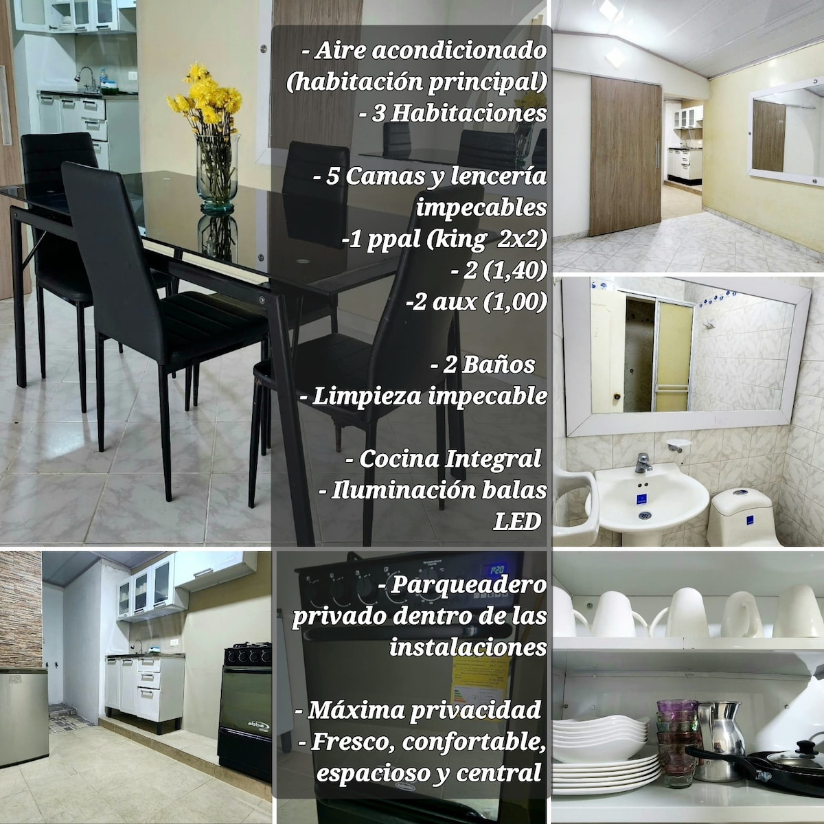 Relájate en este acogedor espacio, tranquilo y confortable , con la comodidad de una sala agradable para su estadía, TV, wifi, tres habitaciones con seis cómodas camas, una hermosa cocina equipada, juegos de mesa, para compartir en familia con tu pareja o amigos.