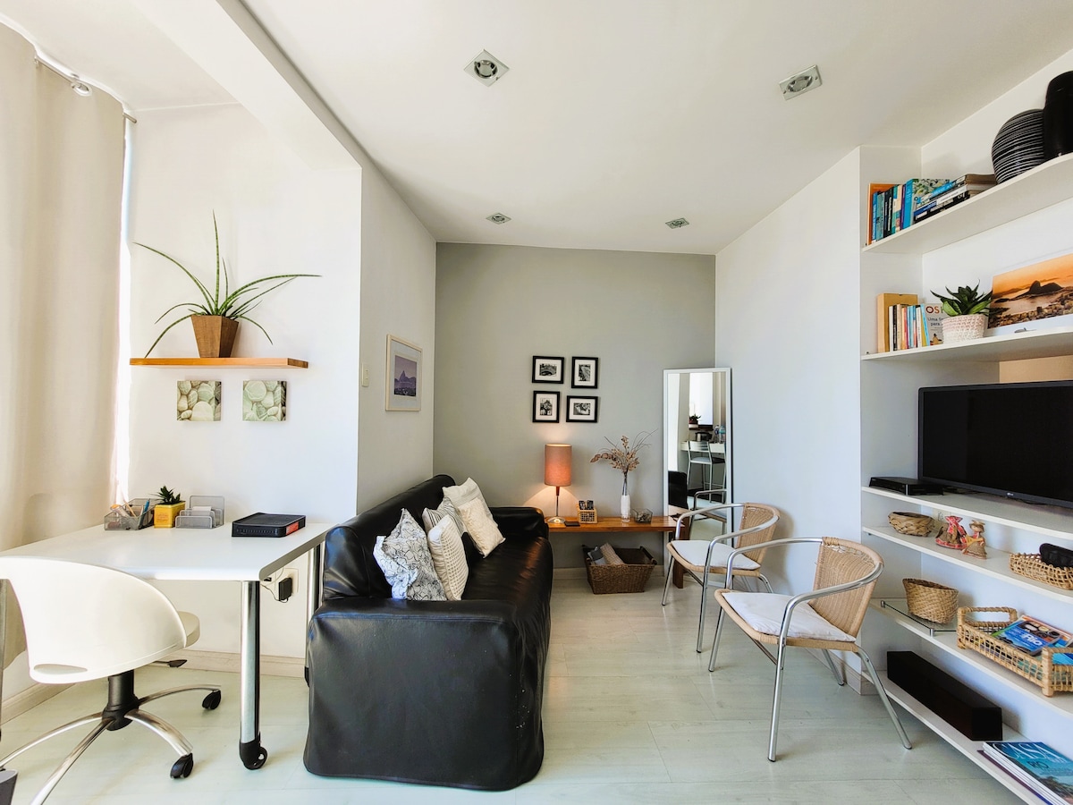 The stylishly decorated loft features an open concept with a wooden divider separating the bedroom from the living room and kitchen. It has 2 TVs, one in the bedroom and one in the living room. With a comfortable double bed, many windows bringing in natural light, a kitchen integrated with the living area, and a spacious L-shaped balcony with a surreal view of Icaraí Beach. Fully equipped, it's 200m from the beach, close to pharmacies, a market, restaurants, and the most famous street in Icaraí.