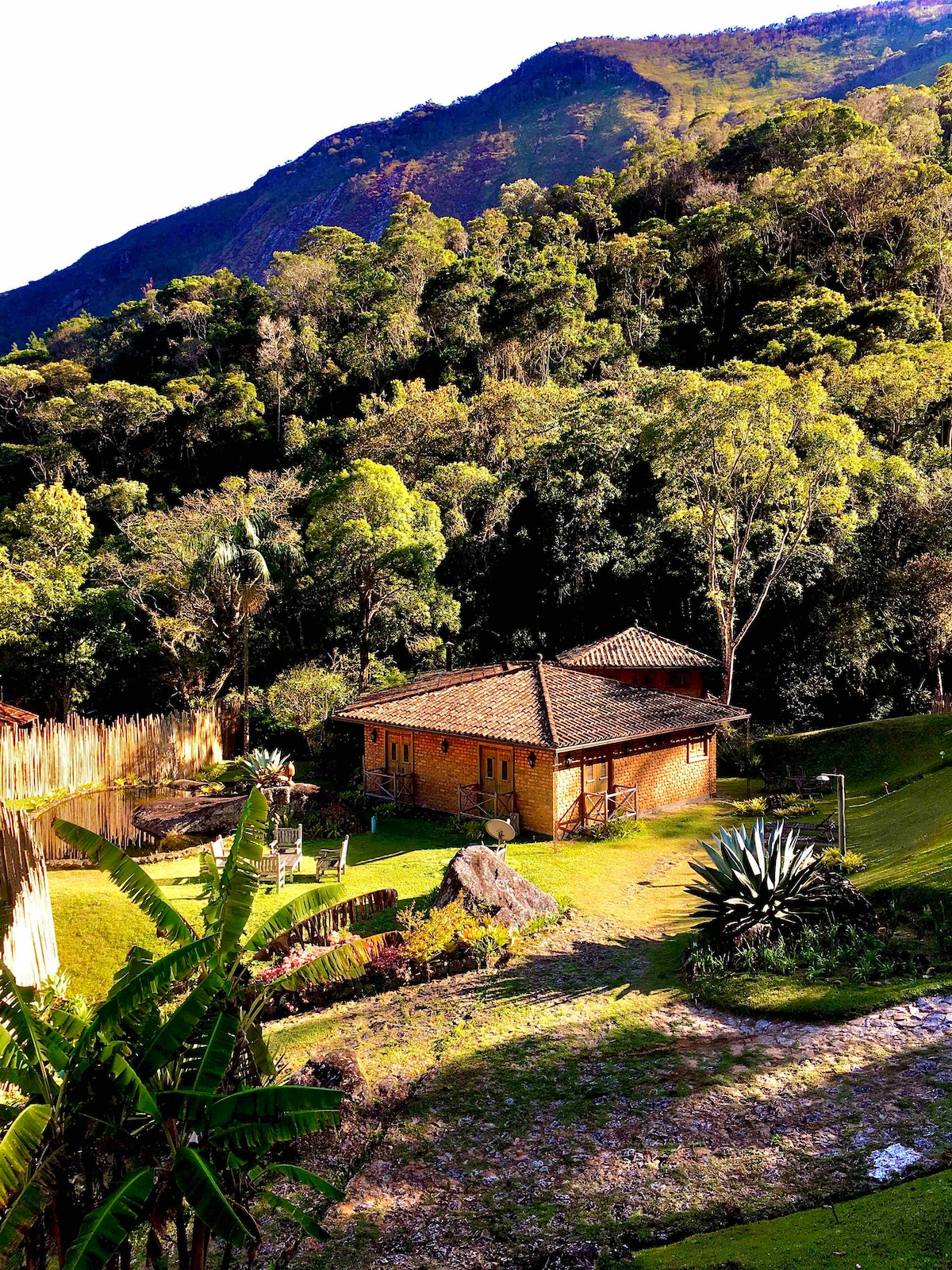 Refúgio para quem quer entrar em imersão total na Natureza . Casa implantada com vistas para os quatro lados . Pico do Cuca , Cachoeira , Floresta e Pôr do Sol deslumbrante . Logo na entrada vc sente uma curiosidade incontrolável de conhecer cada ambiente . No térreo temos a cozinha pequena mas charmosa , quartos com vistas lindas , banheiros com cara de casa de bonecas e sala de jantar de onde subindo uma pequena escada chega na sala de TV ou descer para a sala de estar e Lareira . Imaginem : Acender uma lareira Esculpida numa Big pedra ,que apoia a casa e olhando alguns metros à sua frente depois do Rio para uma linda Floresta . Tudo aqui é uma surpresa inclusive na hora de vc não querer ir embora .