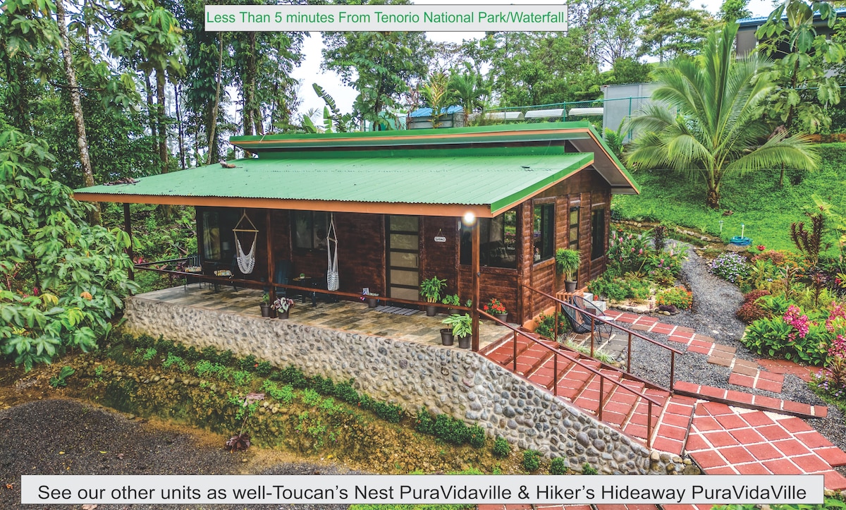 Take it easy at this unique and tranquil getaway/hobby farm nestled on a ridge with amazing valley views, stroll down our trail to your private swimming hole in the magical waters of Rio Celeste…the Blue River. National Park is walking distance, Bird watching, hiking trails, magical views of 3 volcanoes on a clear day, horseback riding, restaurants close by, many tours and activities to enjoy If you are looking for something bigger. We have a 2 bedroom on the same property. Tenorios Treasure 2.