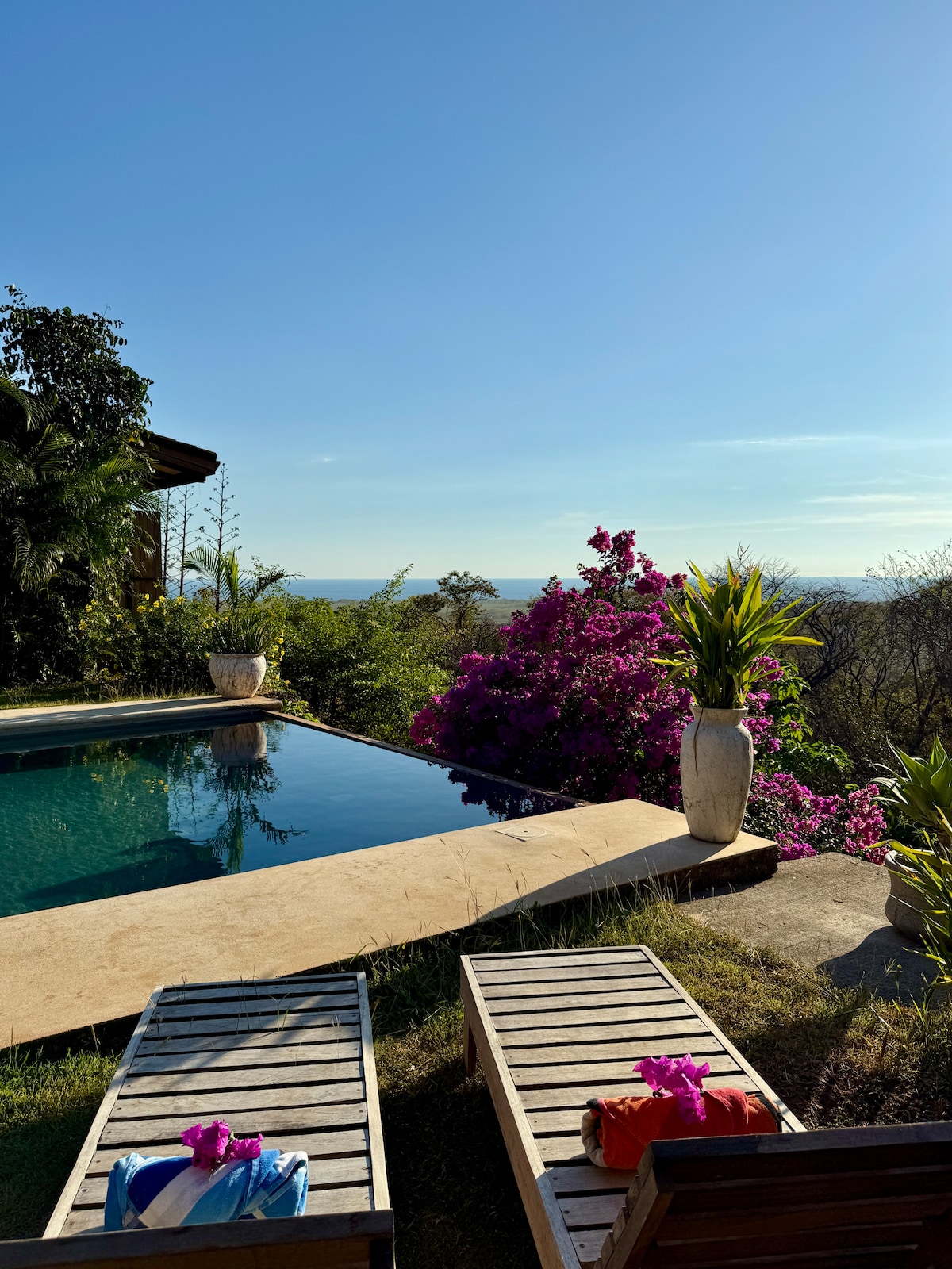Nouvellement rénovée. Séjournez dans une superbe villa avec piscine à débordement privée, située dans une communauté sécurisée, proche des plus belles plages du Costa Rica. Entièrement rénovée en 2025, elle offre confort moderne et vue imprenable. • 2 chambres climatisées avec salles de bain privées • Espace ouvert avec cuisine équipée et salon cosy • Salle à manger extérieure pour admirer des couchers de soleil spectaculaires • Wi-Fi, alarme et parking clôturé