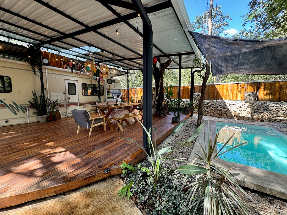 Descubre la experiencia única de hospedarte en una casa rodante cerca de las hermosas playas de Guanacaste. Con aire acondicionado, piscina privada y área de BBQ para momentos inolvidables. Este lugar es perfecto para parejas, familias o grupo de amigos (máx 4 personas). A menos de 1km de Playa Callejones, Playa blanca, 7 minutos de Playa Negra y Junquillal, 20 minutos de Playa Avellanas. Si te gusta surfear, este es tu spot. No te sorprendas si recibes la visita de monos aulladores!