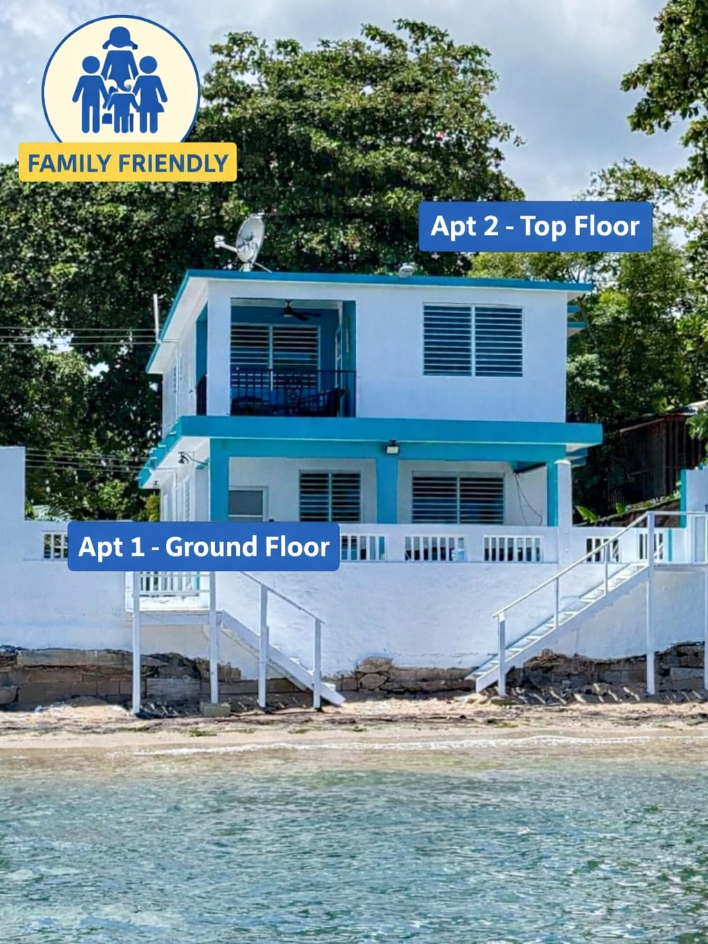 Come and have the most relaxing experience in this beachfront house, with the clear water of the Caribbean Sea as your backyard. This is a 2 story concrete house with 3 bedrooms, 2 bathrooms, 1 full kitchen and a kitchenette. Rooms accommodate 6 people , with 2 additional sofa beds for 4 more. Located in Joyuda, Cabo Rojo, the West Coast of Puerto Rico, where you can enjoy the best seafood restaurants and the most beautiful sunsets of our Island. Rebuilt in 2008 by Certified Contractors of PR.