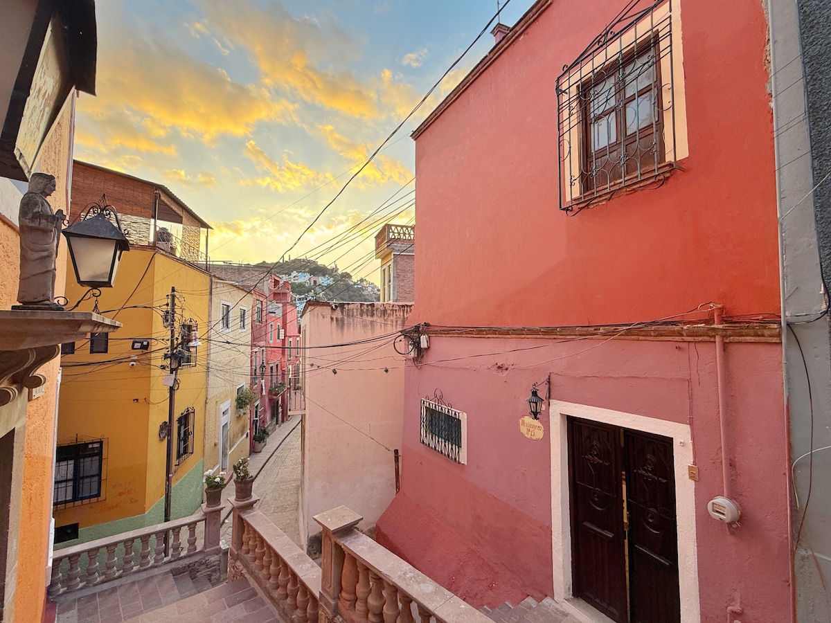 Casa localizada en un callejón peatonal del monumento al pipila. La casa tiene una de las mejores vistas de toda la ciudad lo cual la hace una estancia única. Con cama king size y un hermoso balcón con vista panorámica. La casa se encuentra en medio de un jardín frondoso que permite la privacidad en todo momento. La casa cuenta con dos salidas, a 10 minutos caminando colina abajo del centro de la ciudad y a 4 minutos colina arriba del mirador del Pipila.