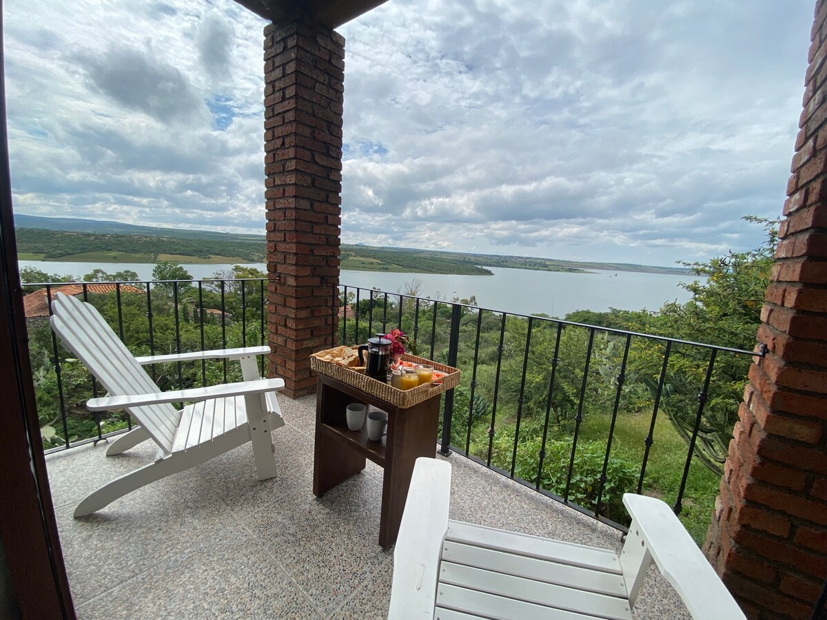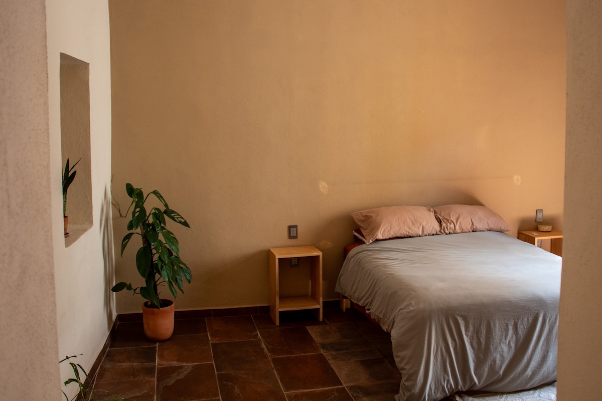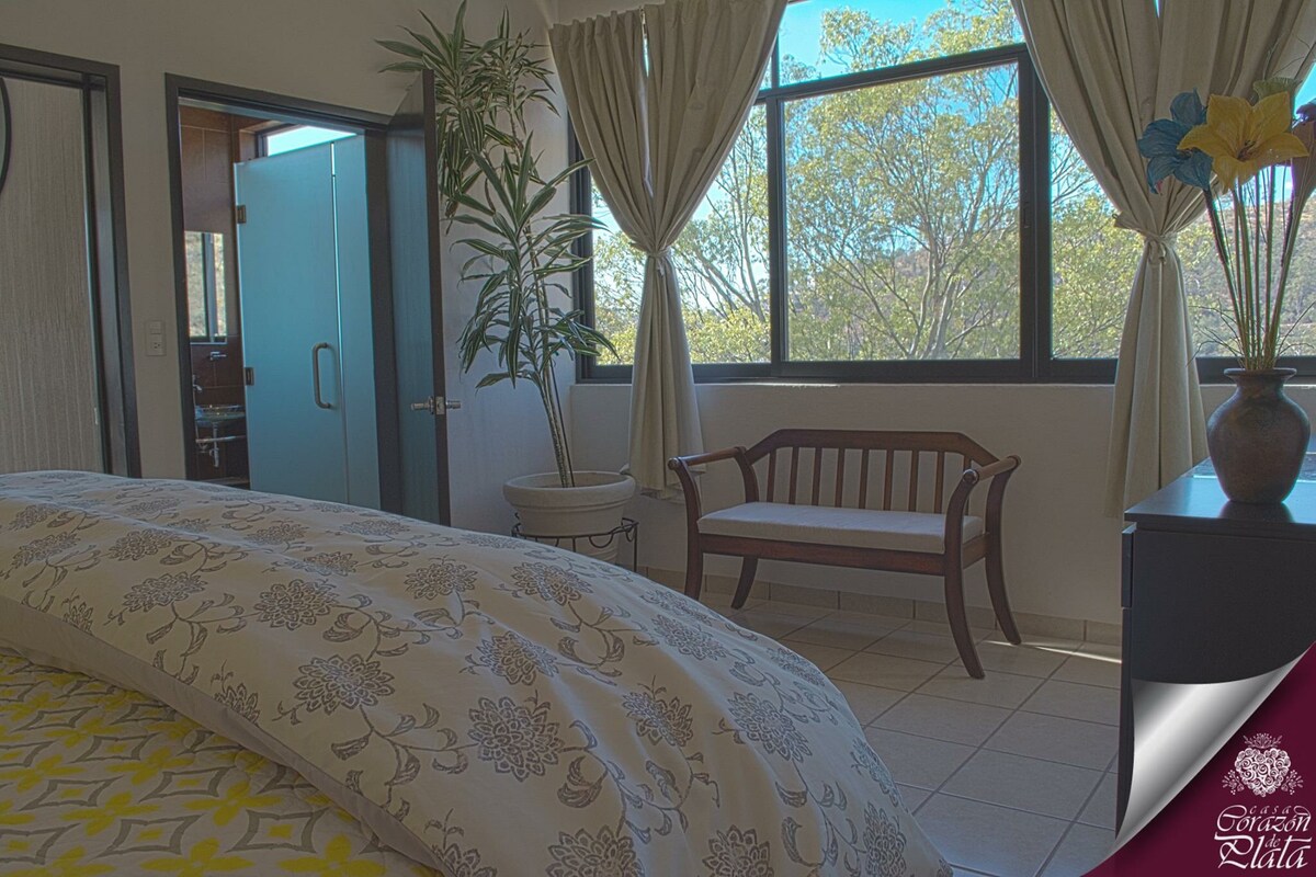 Suite para dos personas con todo lo necesario para pasar una estancia increíble, además la Casa de huéspedes ofrece espacios increíbles como Terraza con hermosa vista donde se les ofrece un desayuno completo de cortesía, una pequeña piscina común y estacionamiento privado.