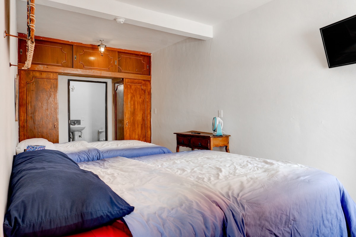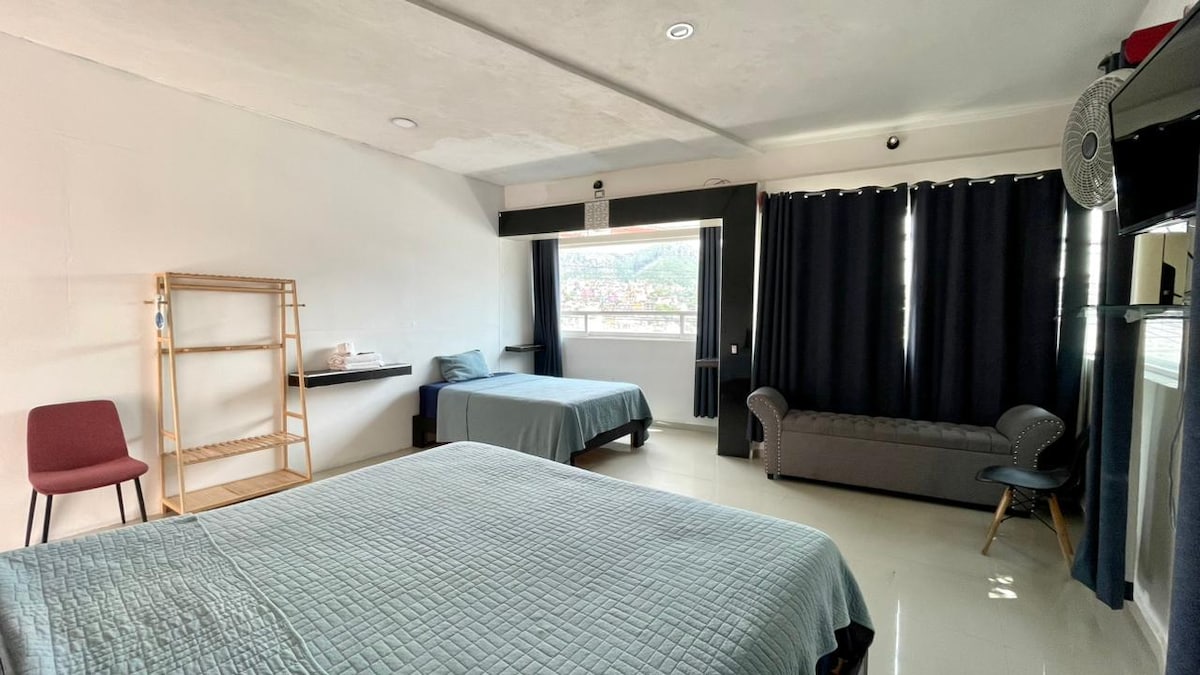 Ubicación Céntrica. Cuenta con una cama king-size, una cama matrimonial y un sofá-cama. Wifi y agua caliente las 24 hrs. Baño privado en la habitación. Estacionamiento con circuito cerrado dentro de la propiedad.