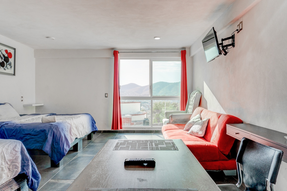 Disfruta del fácil acceso a tiendas y restaurantes desde este encantador espacio para hospedarte a 5 minutos de la plaza de la Paz y de la Universidad de Guanajuato. Ya sea para descansar o trabajar, desde este pintoresco lugar donde los cánticos de las estudiantinas, los colores y sabores de nuestra tierra y una vista inigualable, te harán regresar. Desayuno continental, pan, café, fruta de la estación.
