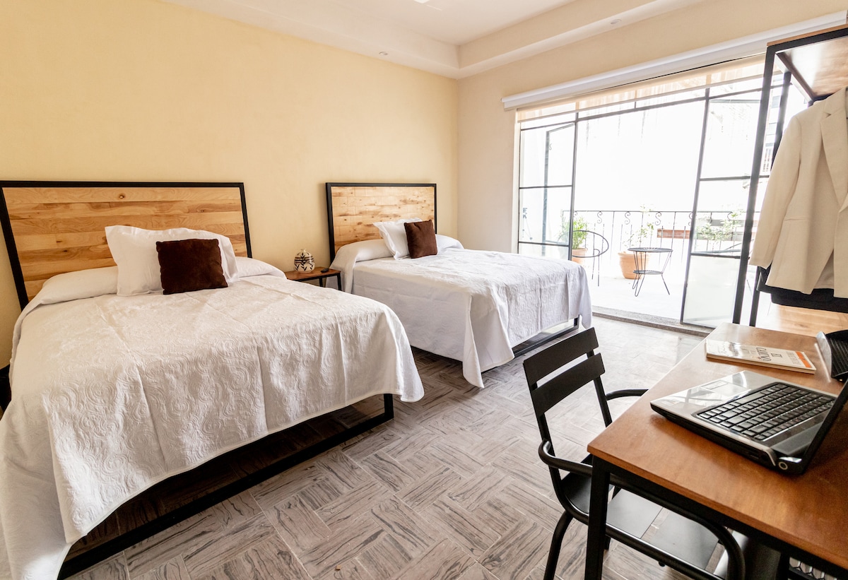 Beautiful colonial style room with separate entrance, garage for small or medium car depending on availability (previous request), private bathroom, king-size bed, large plasma TV, equipped kitchenette, Wi Fi, large window overlooking the Bufa hill, garden and beautiful terrace (common areas) we are located in the center of the city, the main tourist attractions in the historic center is a 10 minute walk!