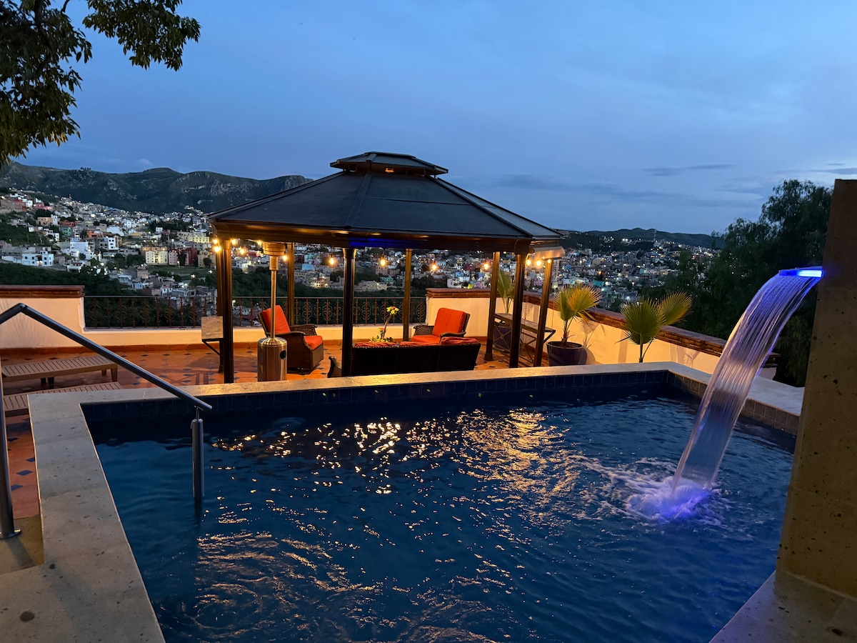 Un refugio exclusivo diseñado para parejas que buscan privacidad, diseño y una experiencia inolvidable en Guanajuato. Disfruta de un jacuzzi privado climatizado con vista panorámica a la ciudad. De día, la luz natural enmarca los colores del centro histórico; por la noche, las luces crean el escenario perfecto para una escapada romántica.
