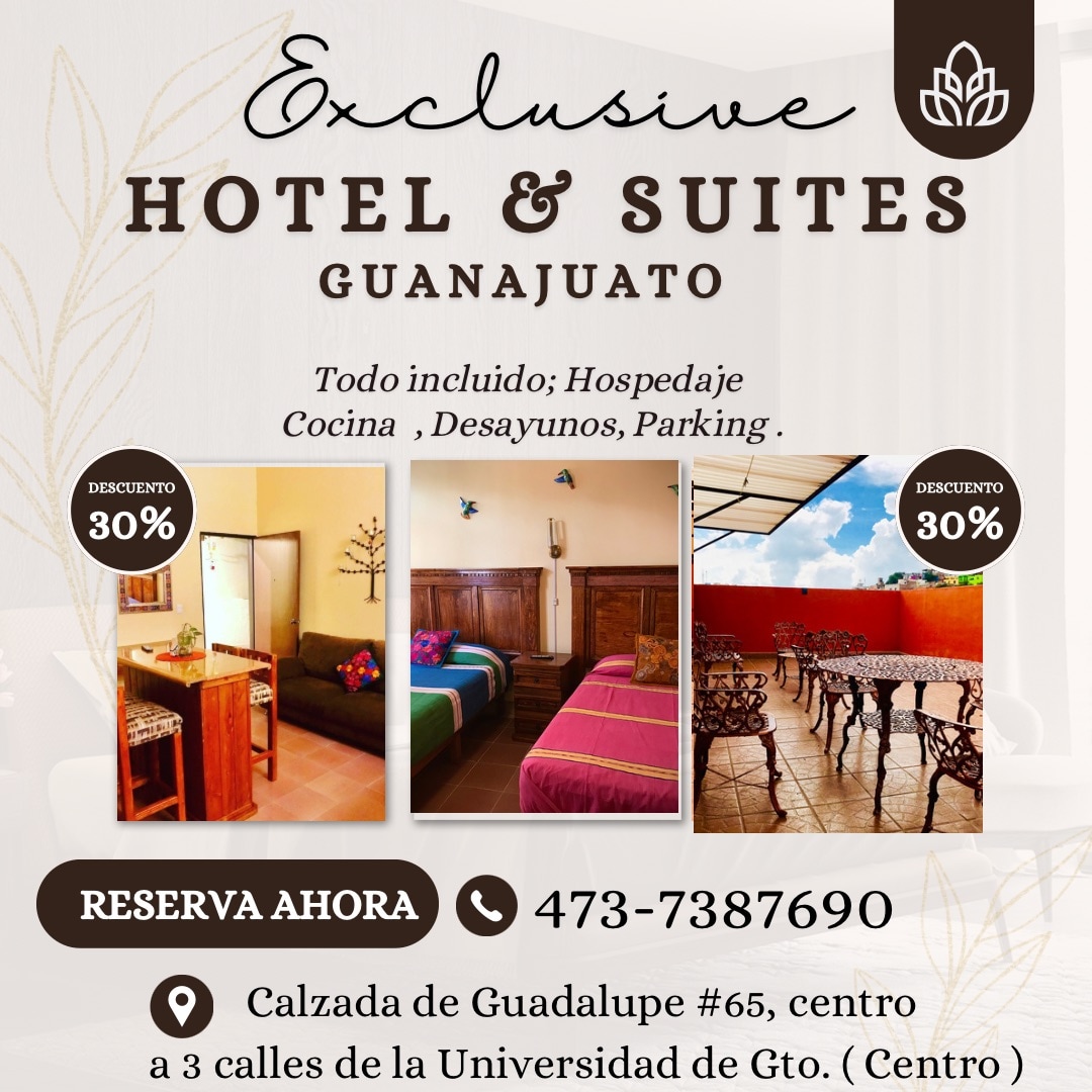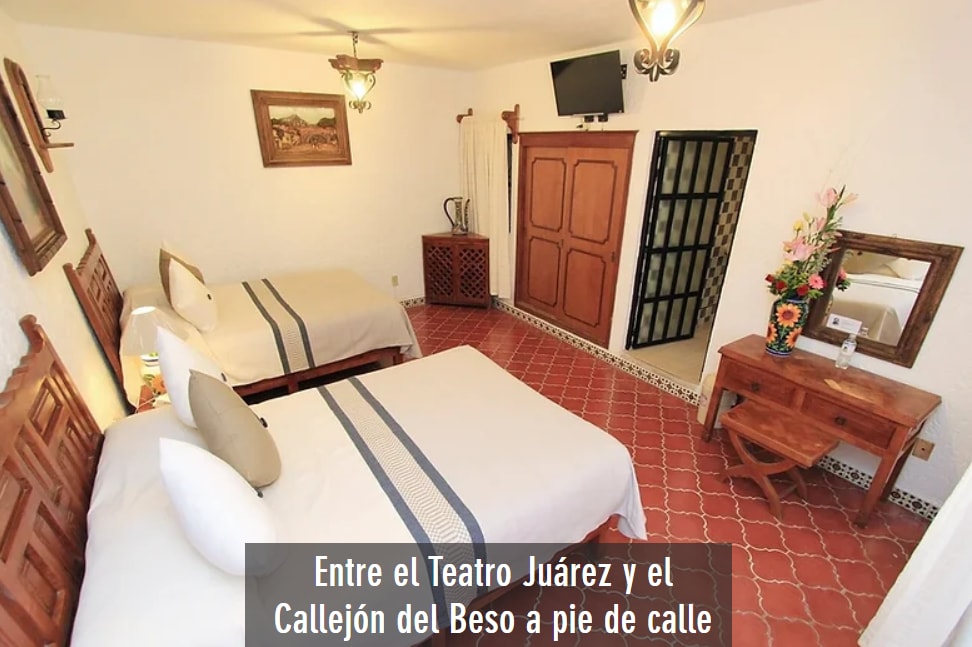 Nos ubicamos entre el Teatro Juárez y el Callejón del Beso a pie de calle. *En el Corazón de la Ciudad. Rodeados de plazas, plazuelas, monumentos y el corredor turístico. A 1 minuto caminando del Teatro Juárez, Callejón del beso, la Universidad y mucho mas. *Infinidad de restaurantes y bares al rededor del hotel. *Sin costo extra por limpieza Si quieres algún tour preguntas al llegar. * Si necesitas traslados al aeropuerto con gusto te podemos dar el servicio (costo extra)