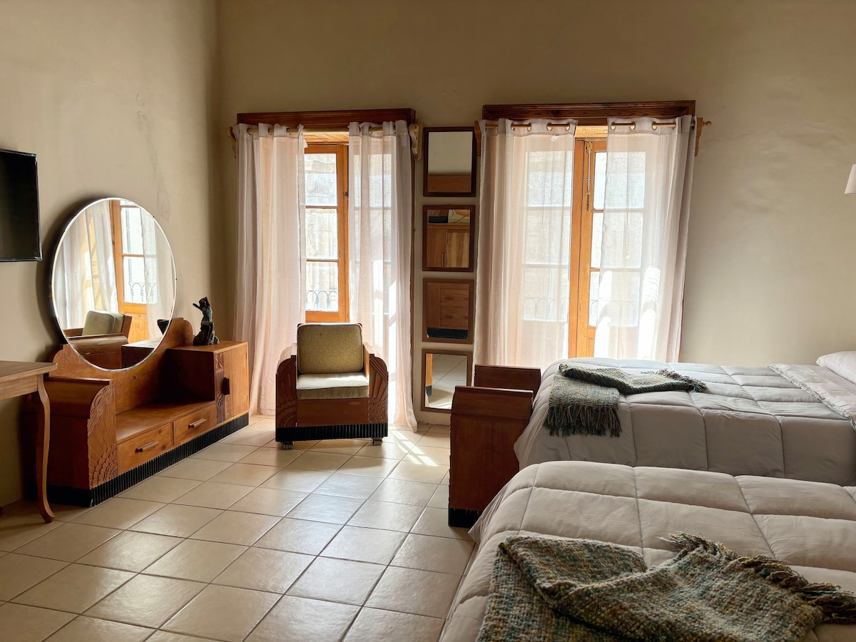 Hospédate en el Hotel Habitaciones Sopeña 5, Habitacion #5 con dos camas King Size y balcon a la calle, ubicado en el corazón de Guanajuato, a solo un minuto del Teatro Juárez y del Jardín Unión. Su ubicación privilegiada te permite disfrutar a pie de los principales atractivos, restaurantes y tiendas del centro histórico. Vive la experiencia local desde un espacio con encanto, comodidad y el auténtico ambiente guanajuatense.