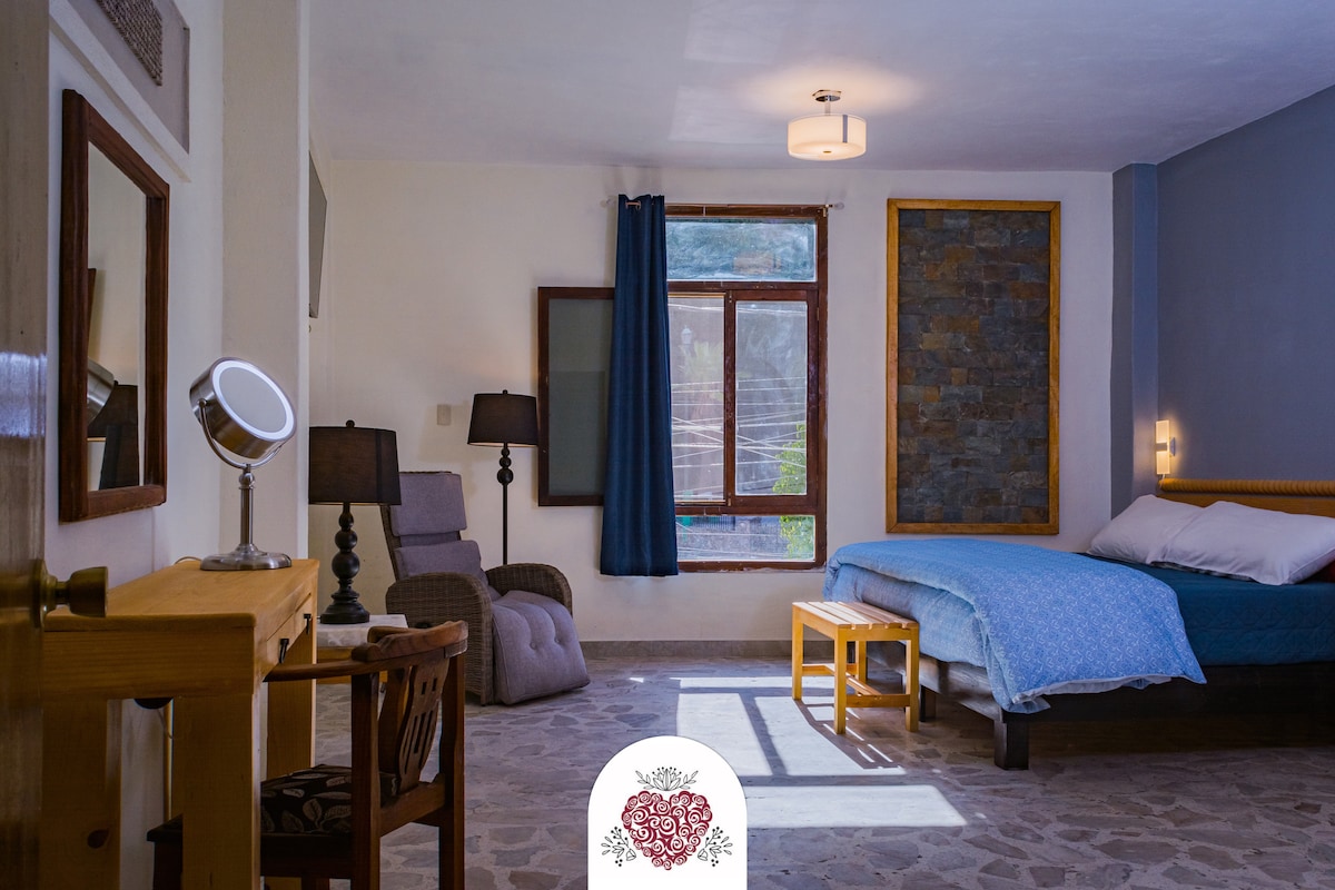 Enjoy the most Guanajuato-style place, full of color and harmony. Room with a double bed, private bathroom, parking, and panoramic view. Covered pool open from 10 a.m. to 8 p.m., with 3-hour access per night booked. If you want to stay longer, you can as long as there are no more than 15 people at the same time. Close to the Museo de las Leyendas, Presa de la Olla, and a 20-minute walk to the historic downtown. Your authentic experience starts here!