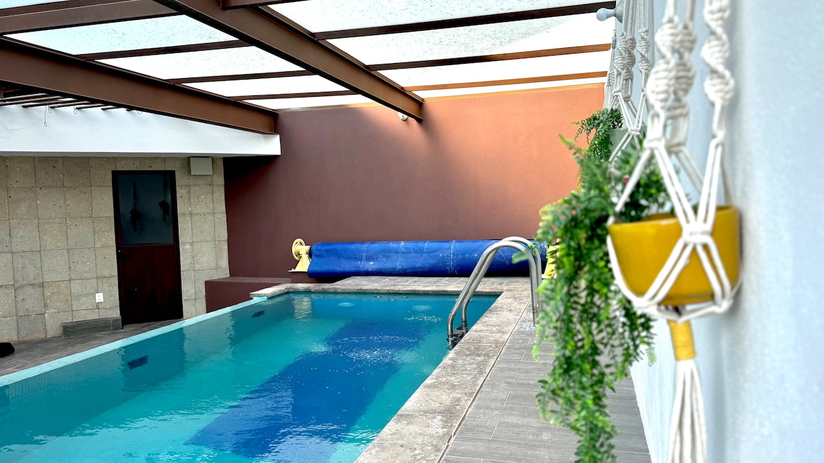 A private detached casita with its own entrance and set within one of the largest and finest gardens in the city. Enjoy your private saltwater swimming pool (40ft x 12 ft) available to guests from 10am - dusk. Secure free private parking and an easy, safe stroll to the historic Centro just over a kilometre away . A 8 minute walkto one of the best language schools in the city. Kitchen/Living Room, Queen Bed, Private Patio (with BBQ) and Rooftop Terrace with gorgeous mountain and city views.