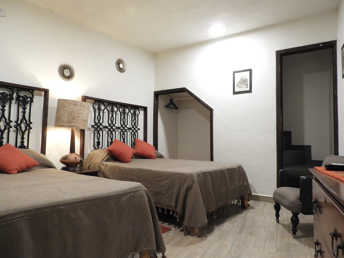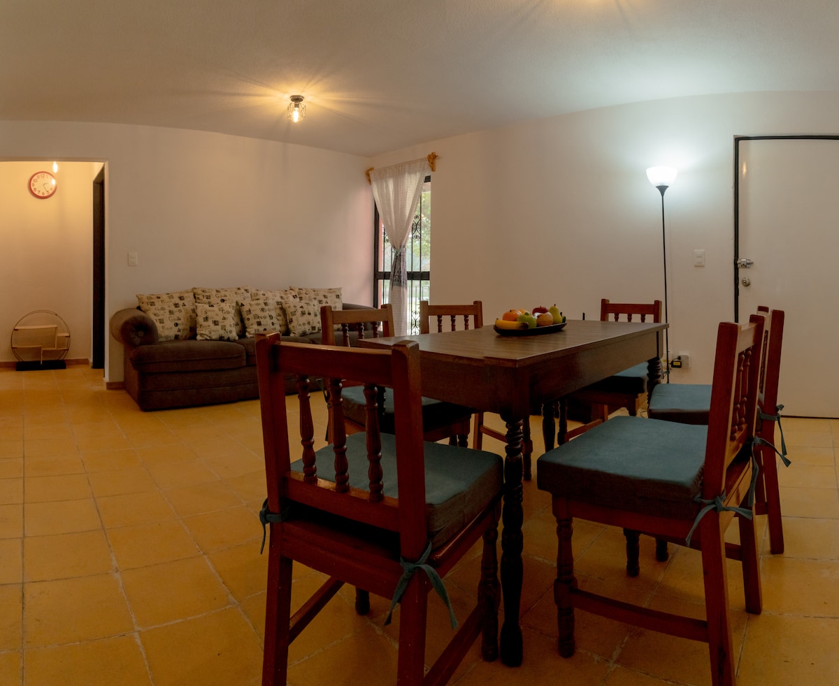 En el departamento la decoración estilo mexicano contemporáneo crea un ambiente relajante. Se ubica en la zona centro de Guanajuato. Es un espacio acogedor con sala comedor que incluye sofa cama y tv de 50 pulgadas con Roku, cocina equipada con estufa, tarja, frigobar, horno y cafetera. Recamara con 2 camas matrimoniales, baño, jardín interior y patio de servicio.Proporcionando: wifi, Telecable, MAX y ESTACIONAMIENTO INCLUIDO PARA 1 AUTO MEDIANO o PEQUEÑO: 4.70m x 1.85 m (L x h) máximo.