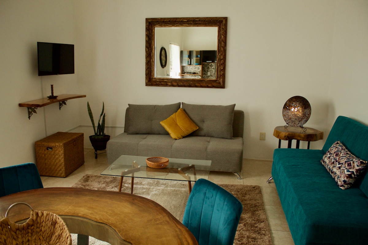 Departamento con un diseño que lo distingue, en la sala se encuentran dos sofa-camas, el cuarto principal cuenta con cama matrimonial, ademas su cocina equipada. Este bonito departamento tiene una excelente ubicación, a solo 5 min caminando del Jardín Union, Teatro Juarez, Restaurantes, Museos, Bares y más atracciones.