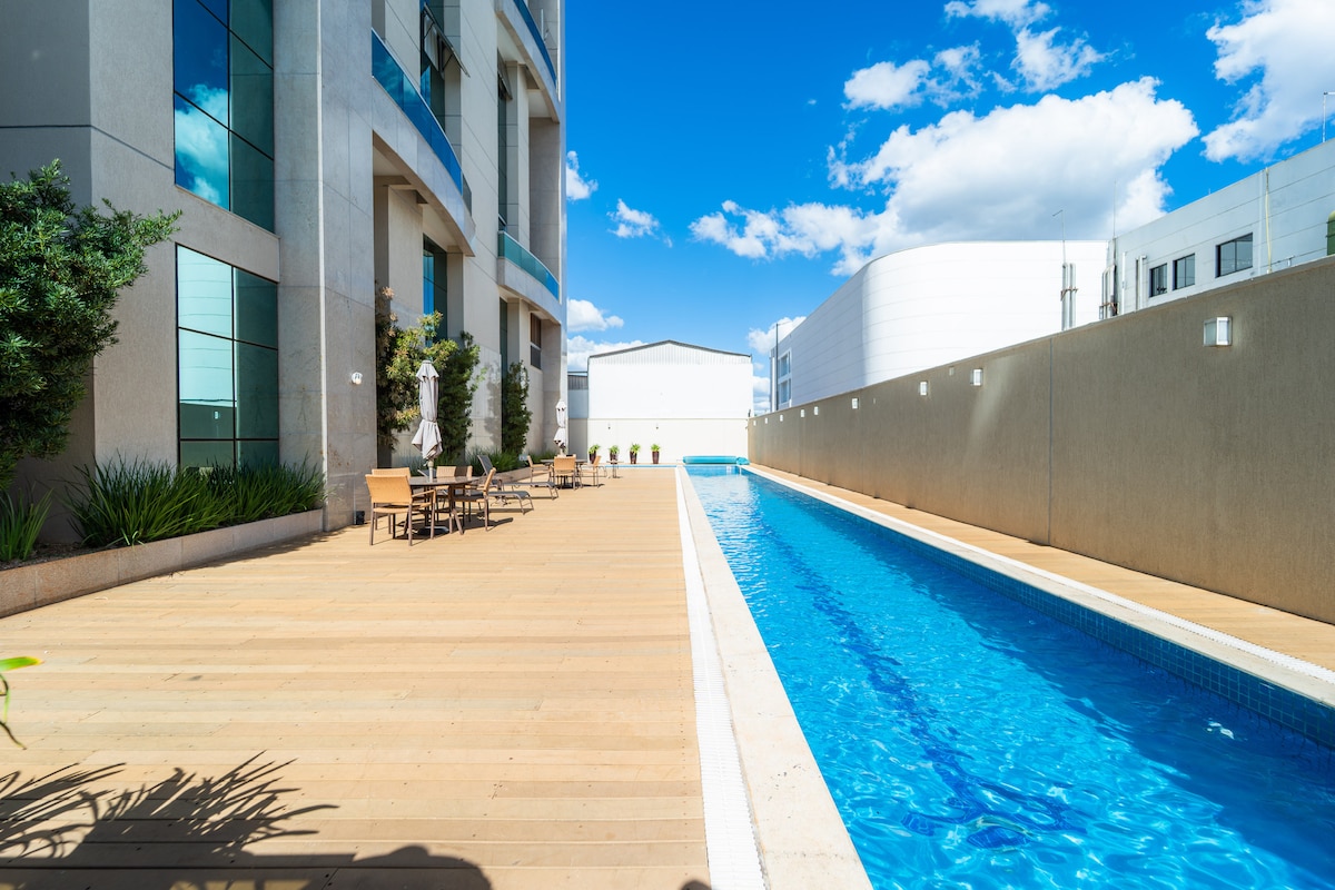 Tranquilo para trabalhar e descansar. A 9min do aeroporto, 4km do lago Paranoá e ao lado do Casa Park e Park Shopping. Estrutura 4 estrelas com 4 piscinas (semi-olímpica é aquecida) sauna e academia. Business center, recepção e restaurante são 24h. Apto tem microondas, fogão, frigobar, filtro de água, cafeteira, panelas, liquidificador, sanduicheira e utensílios. Banheiro tem secador de cabelos e barra de segurança. Cobertor extra, ferro e tábua ficam no armário. Wi-Fi muito bom e a Tv é Smart.