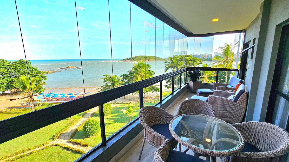 Apartamento com 4 suítes climatizadas, super aconchegante e decorado, ar na sala e varanda, enxoval completo, pés na areia, condomínio seguro com porteiro 24h, 2 vagas de garagem e estrutura completa. 🚗⚡️carregador veicular! Essa acomodação, localizada em Guarapari-ES - Praia de Peracanga, em alto padrão, foi detalhadamente preparada pra receber hóspedes rigorosos. Situada exatamente na beira do mar e com acesso direto na areia da praia de PERACANGA . Sem necessidade de atravessar a rua.