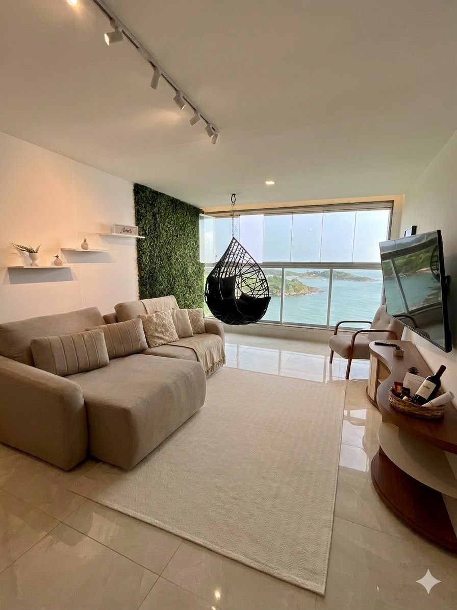 Conforto, luxo e tranquilidade. Isso você encontra em nosso apartamento que foi cuidadosamente projetado para lhe proporcionar uma experiência inesquecível com o MAR. Nesse ambiente arquitetônico clean, moderno, tecnológico e sofisticado você poderá usufruir da sensação de estar em um navio em alto mar. Você merece ter essa experiência! Sinta o cheirinho do churrasco com essa bela vista enquanto relaxa em nosso balanço panorâmico. Você não vai se arrepender!