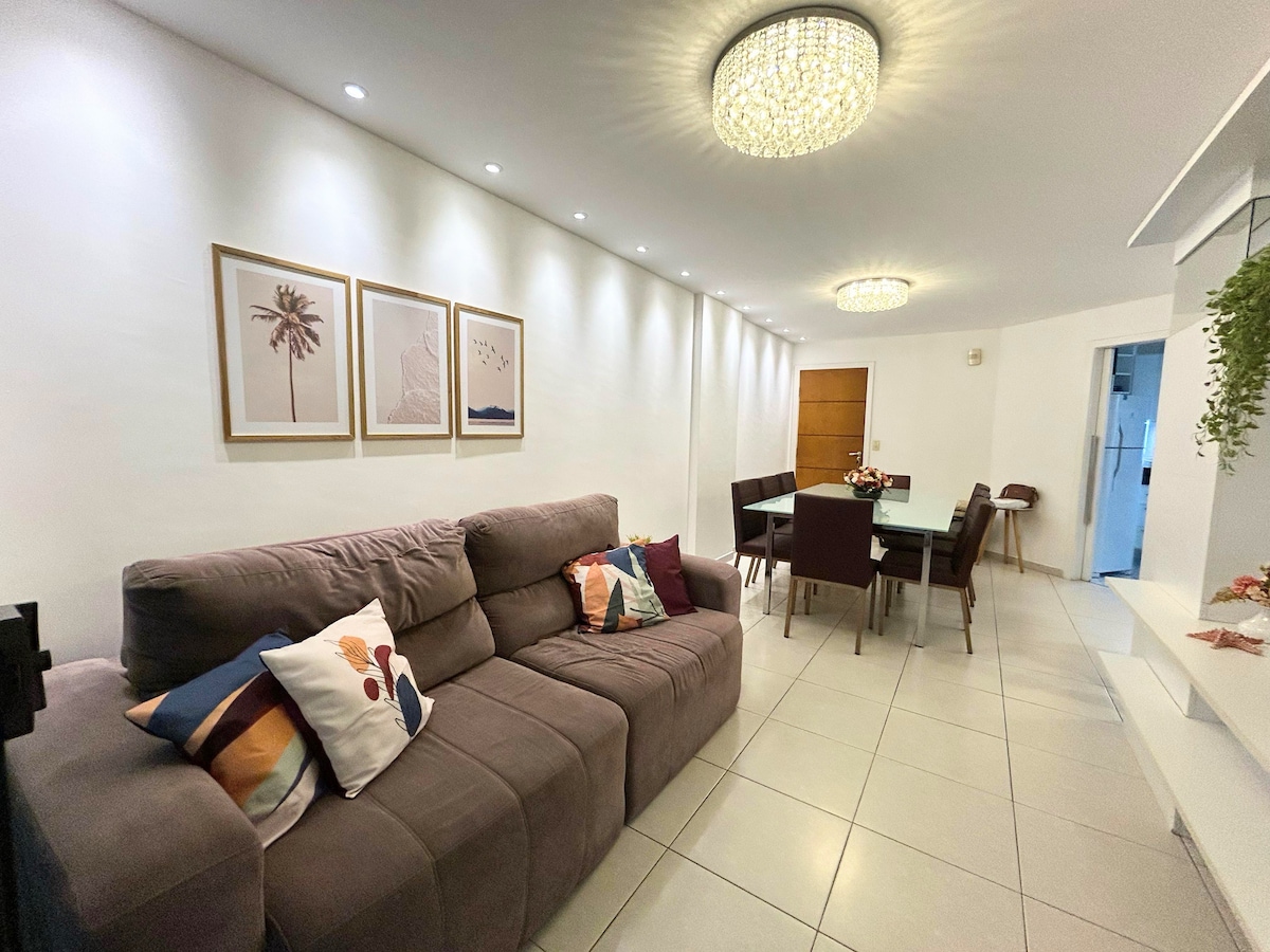 Cozy, airy apartment, morning sun, frontal and permanent view of the sea. With capacity for up to 06 people (02 sofa beds, 01 double bed and extra mattress) located between the beaches: Praia de Areia Preta and Praia do Riacho. 24h concierge, elevator, parking and a spectacular view. Apartment with vintage decor to provide all your comfort and well-being. Possibility of scheduling transport from the Airport / Bus Station to Guarapari and tours in the region.