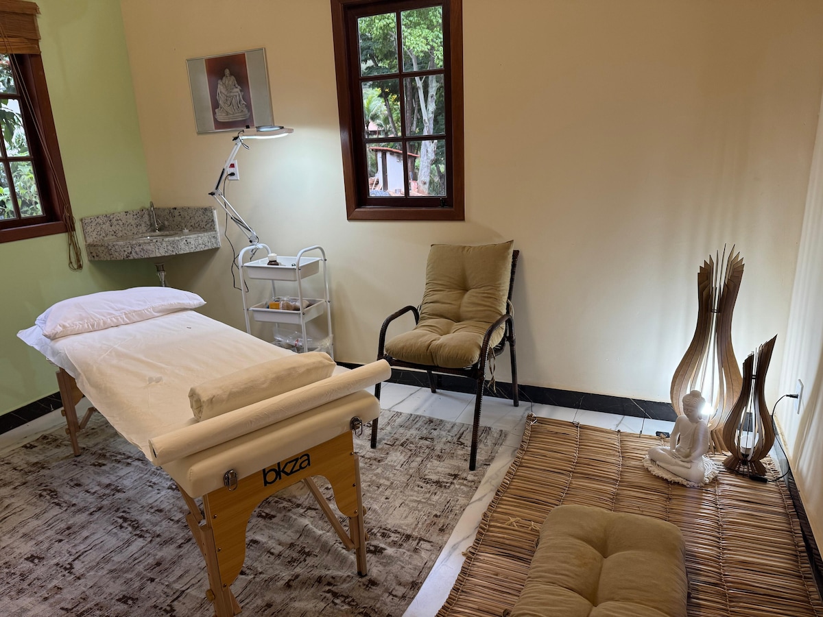 Viva dois dias de descanso profundo com hospedagem em suíte, 3 refeições vegetarianas/dia e acesso a trilhas, piscina e redário. Inclui 2 sessões terapêuticas à sua escolha: Shiatsu/Reiki, Massagem Abdominal + Auriculoterapia ou Acupuntura (75 min). Uma imersão individual para renovar corpo e mente em meio à natureza.