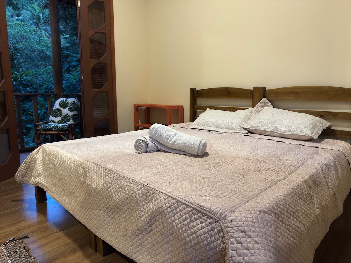 With two verandas — one of them private — the Acerola Suite is a charming retreat for couples or travelers seeking simplicity with a touch of elegance. The space is independent, surrounded by nature, and decorated with handcrafted details that bring warmth and inspire relaxation. It accommodates up to 2 guests, with the option of a double bed or two single beds, and includes a private bathroom for comfort and privacy. Perfect for those wishing to slow down, breathe fresh air, and reconnect.