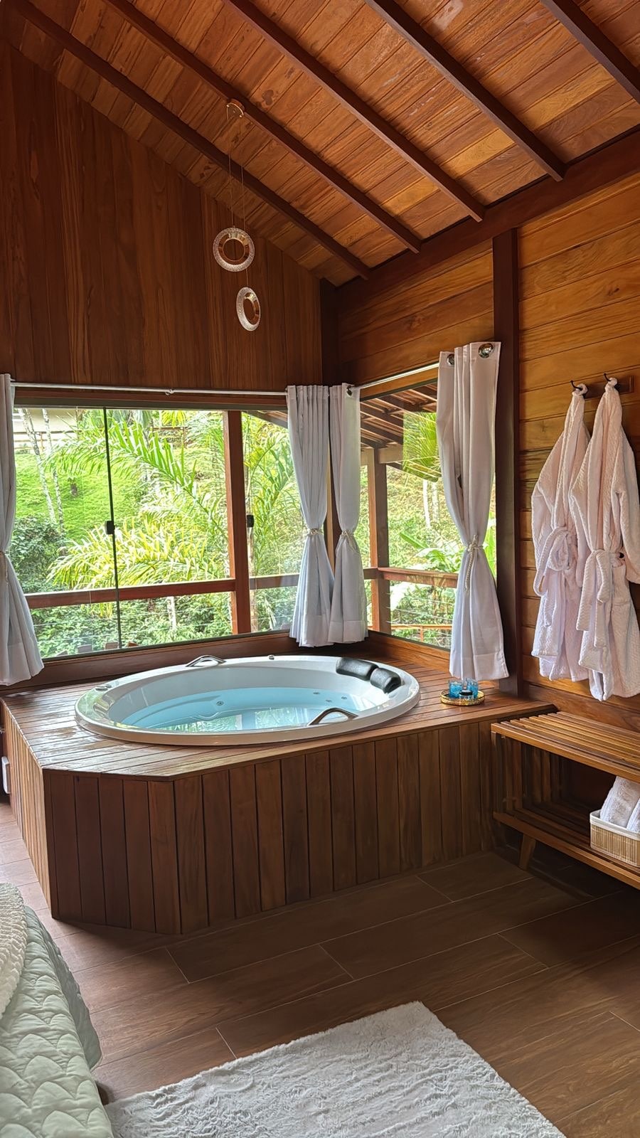 Chalé aconchegante no Recanto Nascer das Águas, com banheira de hidromassagem, chuveiro elétrico, ar-condicionado, Wi-Fi, cama, frigobar e TV. A área comum oferece duas piscinas, churrasqueira, cozinha com geladeira, além de espaço verde, lagoa e lago artificial, proporcionando um ambiente relaxante. Localizado a apenas 15 minutos da praia, é o refúgio perfeito para quem busca tranquilidade e contato com a natureza, com fácil acesso ao mar.