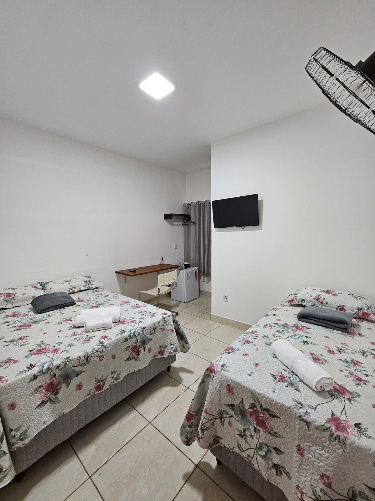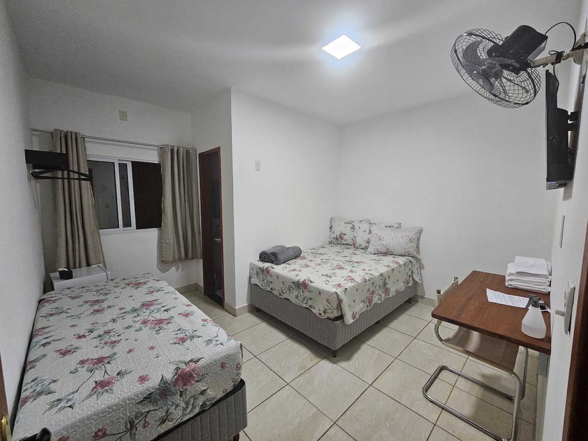 Bem-vindo à nossa aconchegante suíte! Perfeita para uma estadia tranquila e confortável, esta suíte oferece tudo o que você precisa para se sentir em casa: - Banheiro privativo com água quente e fria. - Acomoda até 4 pessoas com cama de casal, cama de solteiro e colchão adicional. - Roupa de cama e toalhas inclusas. - Tv, Frigobar, copos e taças. - Ventilador e cabideiro. - Escrivaninha para trabalho ou refeições. Atenção Não possui nem cozinha nem garagem! Check-in: 14h Check-out: 12h
