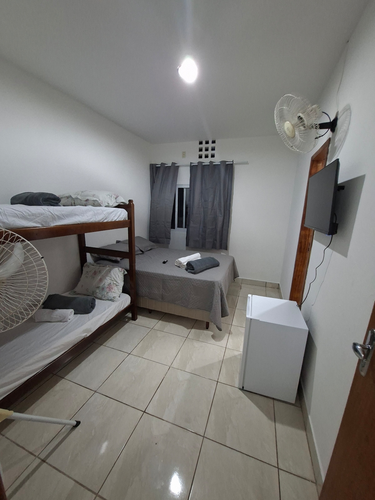 Bem-vindo à nossa aconchegante suíte! Perfeita para uma estadia tranquila e confortável, esta suíte oferece tudo o que você precisa para se sentir em casa: - Banheiro privativo com água quente e fria. - Acomoda até 4 pessoas com cama de casal, cama de solteiro e colchão adicional. - Roupa de cama e toalhas inclusas. - Tv, Frigobar, copos e taças. - Ventilador e cabideiro. - Escrivaninha para trabalho ou refeições. Atenção! Cozinha compartilhada Não possui garagem Check-in: 14h Check-out: 12h