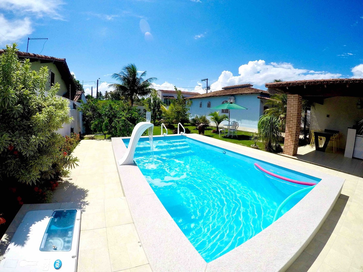 Casa em Setiba, com uma enorme piscina adulta/infantil, area de churrasqueira externa, garagem para 8 carros, 4 quartos sendo 2 suites, 2 banheiros, cozinha completa, sala de tv, amplo espaço externo. Acesso wifi em toda propriedade, e a poucos passos da praia. Casa para até 20 pessoas.