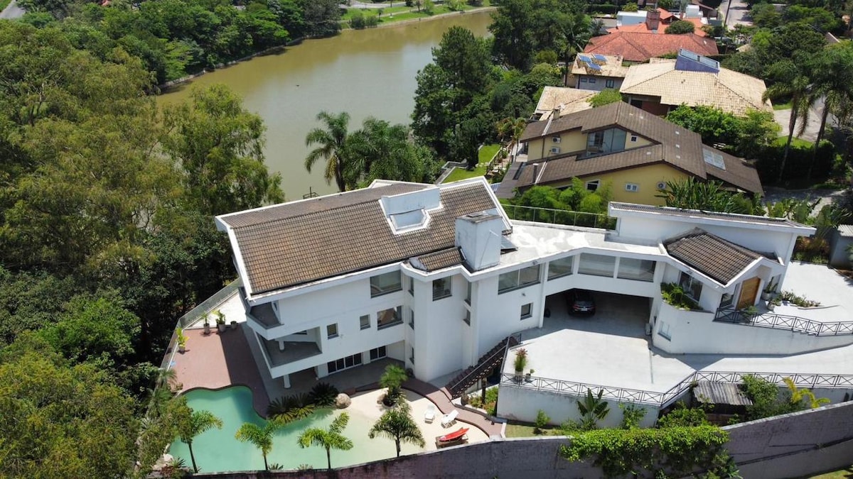 Casa a beira da represa Guarapiranga, com acesso privativo. A casa conta com 4 quartos, onde todos possuem ar-condicionado, 4 banheiros, lareira interna, churrasqueira. ESPAÇO FAMILIAR - NÃO É PERMITIDO FESTAS E SOM ALTO. No condomínio você pode realizar aulas ou alugar equipamentos de stand-up, windsurf, vela, fazer passeios de veleiro e a cavalo e também fazer trilhas a pé ou de bicicleta! Permitimos apenas cachorros de pequeno porte. Não é permitido que os cachorros entrem na hidromassagem.
