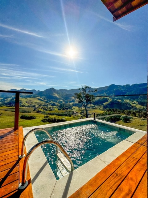 Descubra a magia da Serra da Mantiqueira nesta cabana projetada para que você possa contemplar o nascer do sol sem sair da cama. Venha relaxar em nosso spa aquecido, observar as estrelas na rede suspensa e balanço. A cabana possui um quarto integrado com uma aconchegante cama Queen. Na sala/cozinha, um futon super confortável acomoda mais dois hóspedes, tornando a experiência ideal para famílias. A propriedade também conta com trilhas e pequenas quedas d'água. Este sítio é um refúgio único.