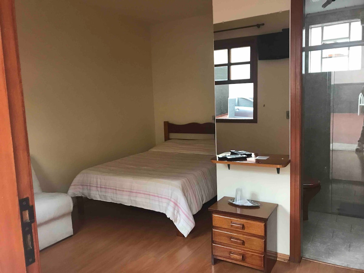 Um quarto pequeno, porém totalmente funcional. Disponibilizamos roupas de cama, incluindo cobertor e travesseiros, toalhas de banho e rosto, sabonete e aquecedor de toalha.