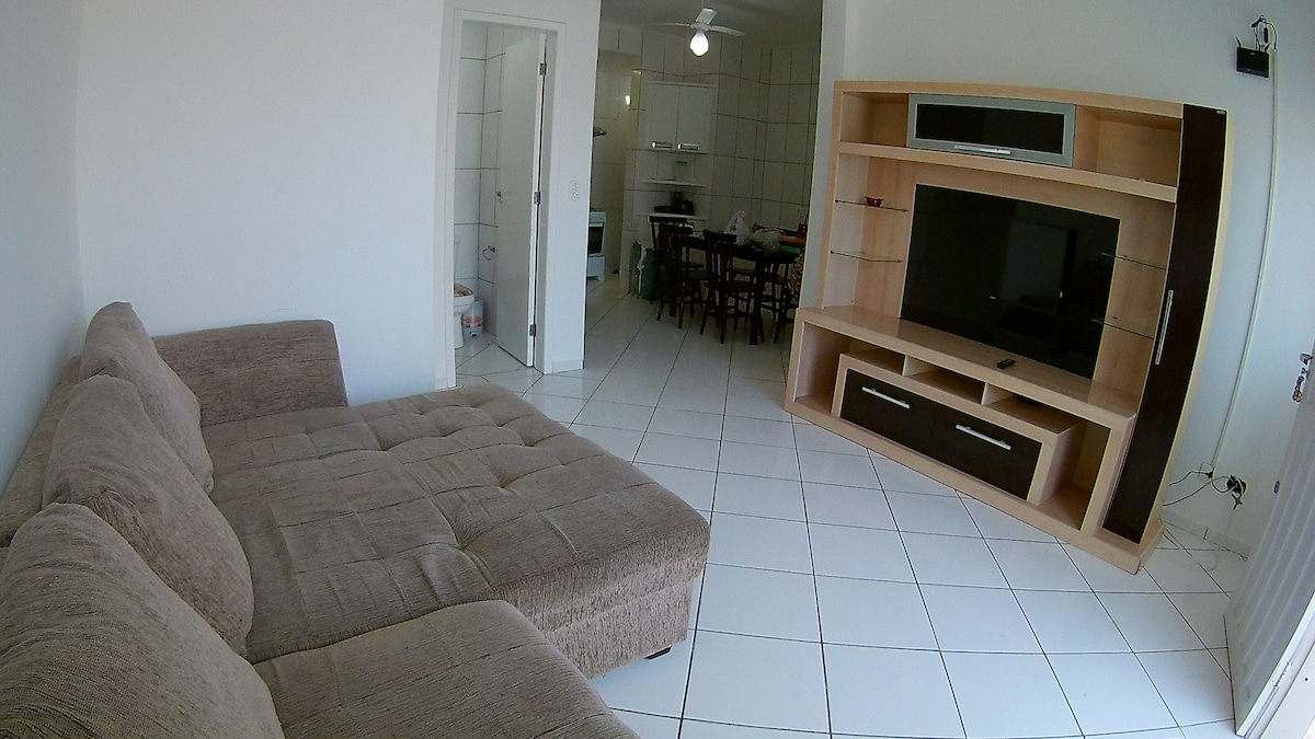 Apartamento de 2 quartos com 2 camas de casal e 1 de solteiro. Localização a 50 m da praia , ao lado do supermercado Brasão (junto com o mercado possui uma praça de alimentação com parque e cinema), Café Curação, farmácia, restaurantes, sorveteria, lojas etc... Vaga de garagem coberta. Cozinha com geladeira, fogão e microondas. Condomínio com espaço com churrasqueira coletiva. Possui wi-fi. Apartamento com rede de proteção nas janelas dos quartos e sacada.