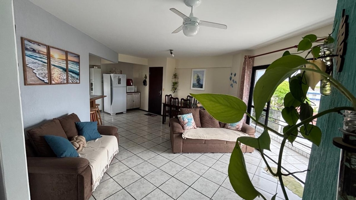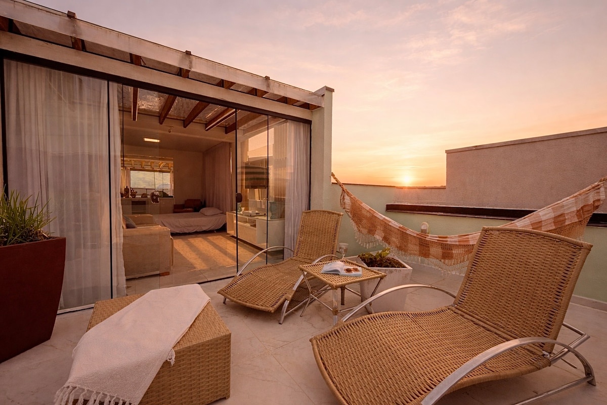 Apartamento na cobertura, a 900 metros da Praia de Caiobá e a uma quadra da Avenida JK, em prédio com apenas 2 unidades. Ideal para casais e famílias que buscam conforto e praticidade: suíte com cama king e colchão extra, sala de estar com sofá-cama, Smart TV e Wi-Fi, cozinha equipada com churrasqueira e ar-condicionado, terraço com espreguiçadeiras para curtir o pôr do sol. Acomoda até 6 hóspedes, com mais conforto para 4 pessoas. Roupa de cama incluída, vaga de garagem coberta e pet friendly.