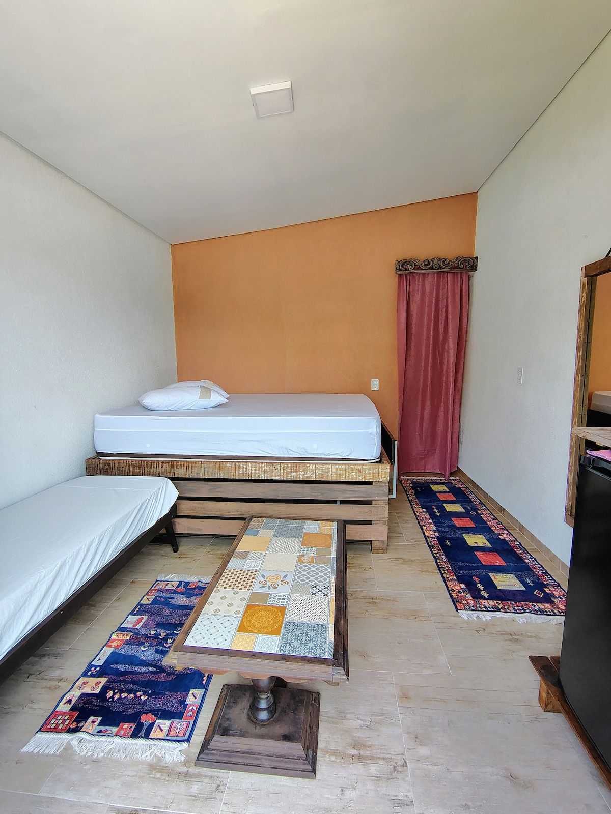 Este é o nosso quarto coletivo, o Vale dos Duendes. Possui 3 beliches, banheiro privativo e 2 ventiladores portáteis. Roupa de cama e travesseiro estão incluídos. Caso necessite de coberta e toalhas, temos esses itens para locação. Nossa cozinha coletiva fica à disposição, respeitando a política da casa. Venha descansar e aproveite para fazer novas amizades!!!