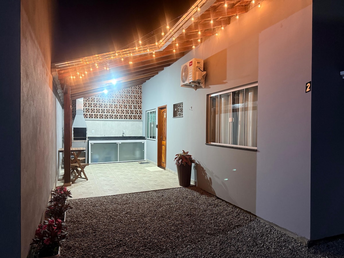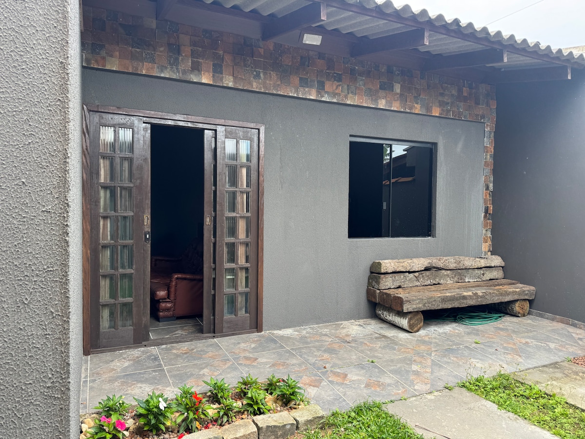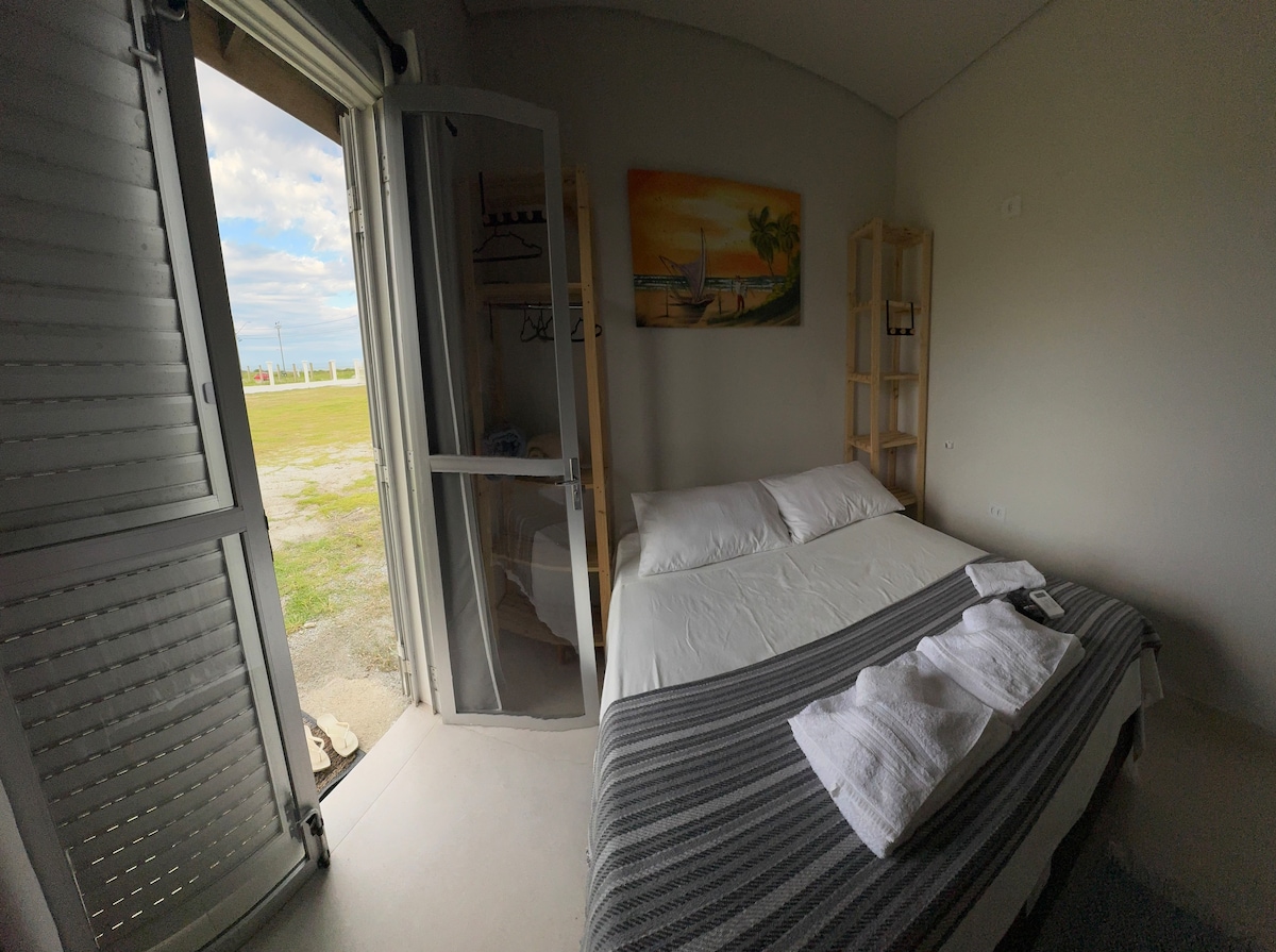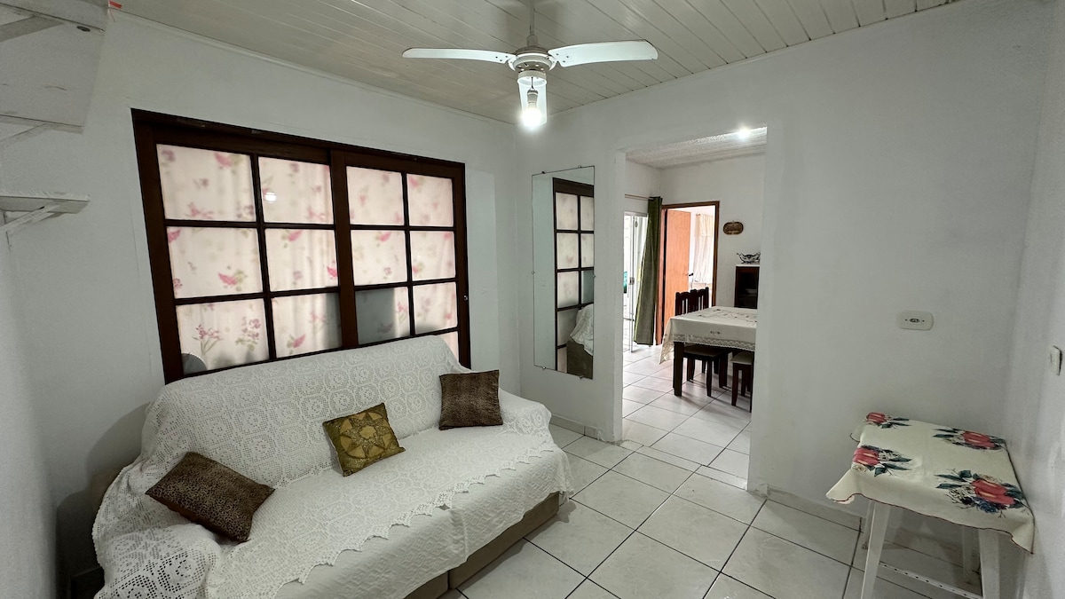 Fica a 1 quadra da praia. Com sala/cozinha (bicama) + 1 quarto (suíte, cama de casal), tem todo conforto para o hóspede economizar $ e cozinhar no local (fogão, geladeira e utensílios domésticos, churrasqueira e lavanderia externa). Acomoda até 4 pessoas. Fica nos fundos da minha casa, possui portão divisorio entre as casas. É permitido pets, desde que dóceis. O carro deve ficar estacionado paralelo à rua (vizinhança tranquila). Avisar sobre checkin após as 21h, pois serão avaliados .