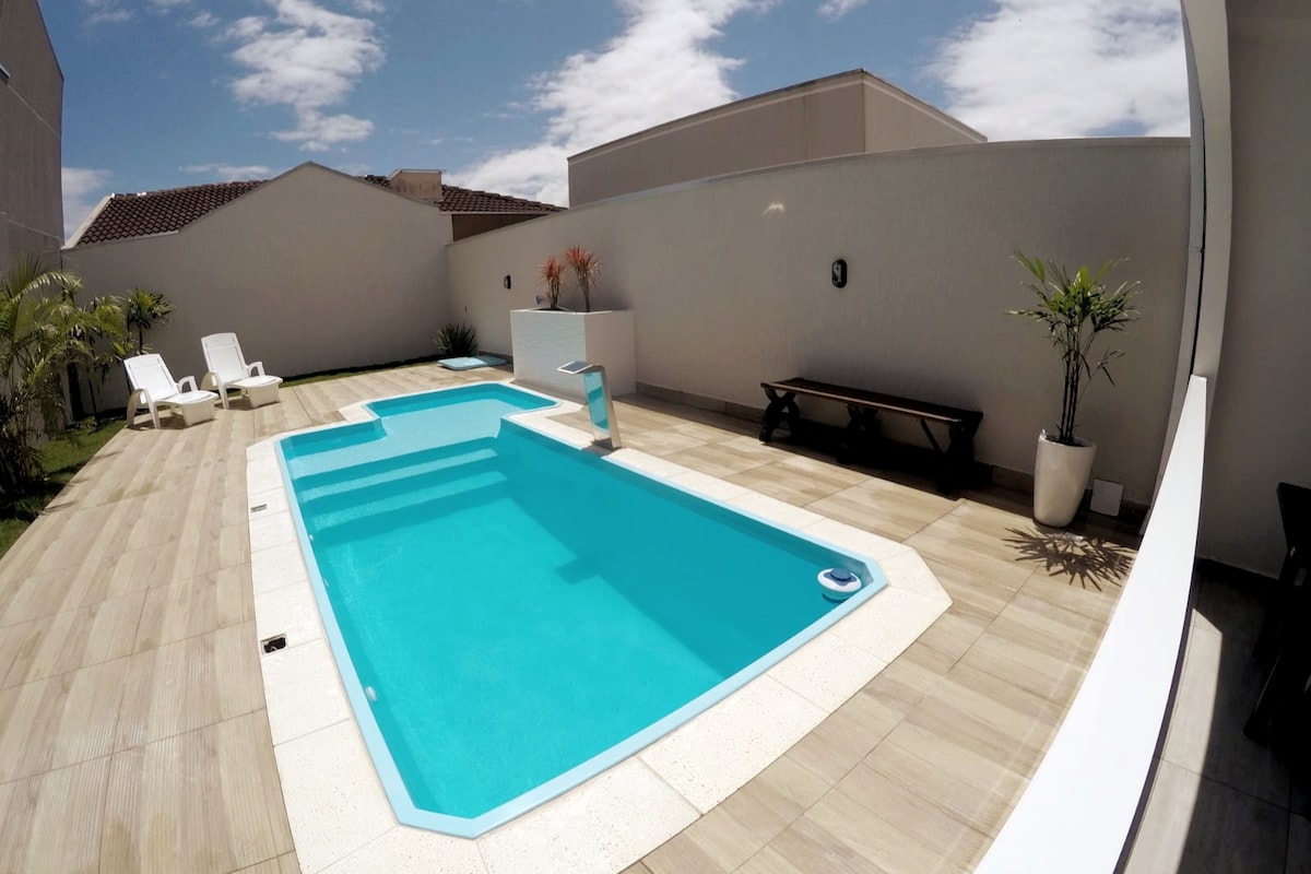 Casa com piscina, churrasqueira e 3 quartos com ar