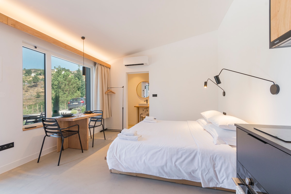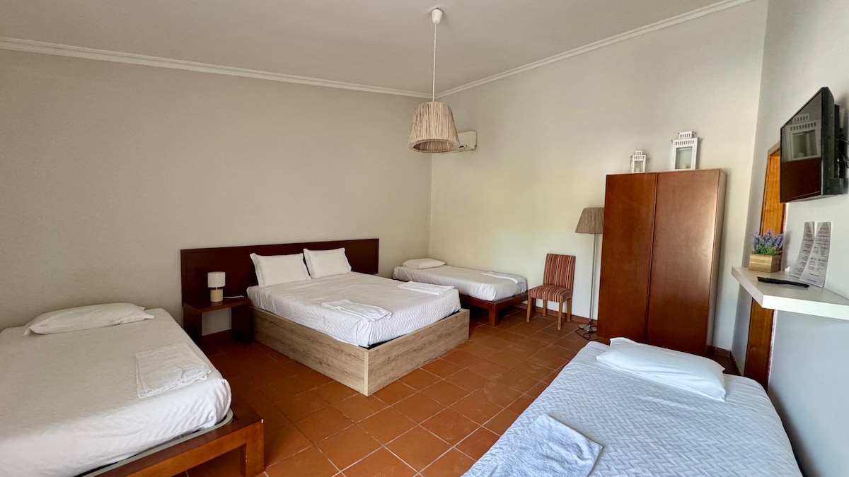 With an enchanting view of the mountains, the Family Room combines comfort and charm, with a double bed and two single beds, ideal for the whole family. A private bathroom, coffee machine and kettle make your stay even more convenient. Breakfast is included and a cot is available (additional cost). Pets are welcome (additional cost). The swimming pool, outdoor areas and breakfast area are shared with other guests in a welcoming and peaceful environment.