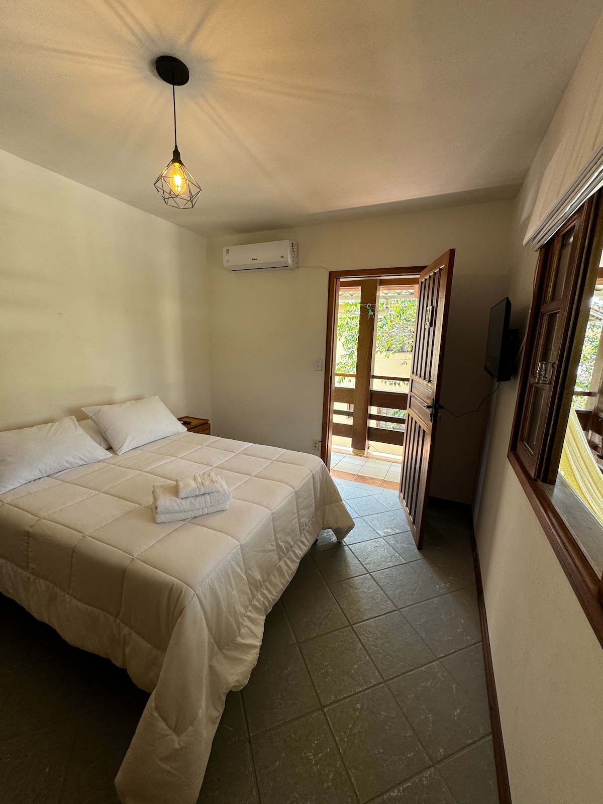 Este estiloso chalé fica no alto do morro com uma vista mar incrível. O espaço foi cuidadosamente decorado e equipado para que os hóspedes tenham muito conforto e privacidade. A casa conta com cozinha privativa, sofá-cama, rede, cama de casal, banheiro privativo, além do aplo espaço comum da pousada com cozinha, churrasqueira, forno de pizza, sala de estar, sofá e uma varanda com vista mar incrível. Localização (Praia do Siriú): - 1,3 km do mar da Praia do Siriú - 9 km do centro de Garopaba