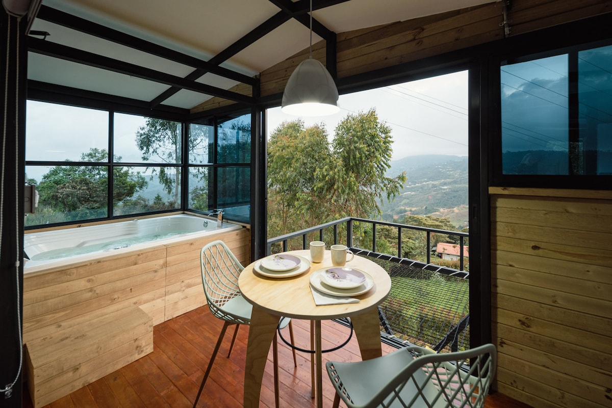 Hermoso lugar con vista al bosque y al valle. Cocina equipada para 4 Personas. Zona de terraza con BBQ. Jacuzzi en terraza totalmente cubierto. Video proyector para entretenimiento Terraza con vista panoramica. Estacionamiento Privado Camas comodas, Espacio de trabajo, zona de Tv. Baño con agua caliente constante, ofrecemos articulos basicos como jabon, papel higienico, toallas, etc.