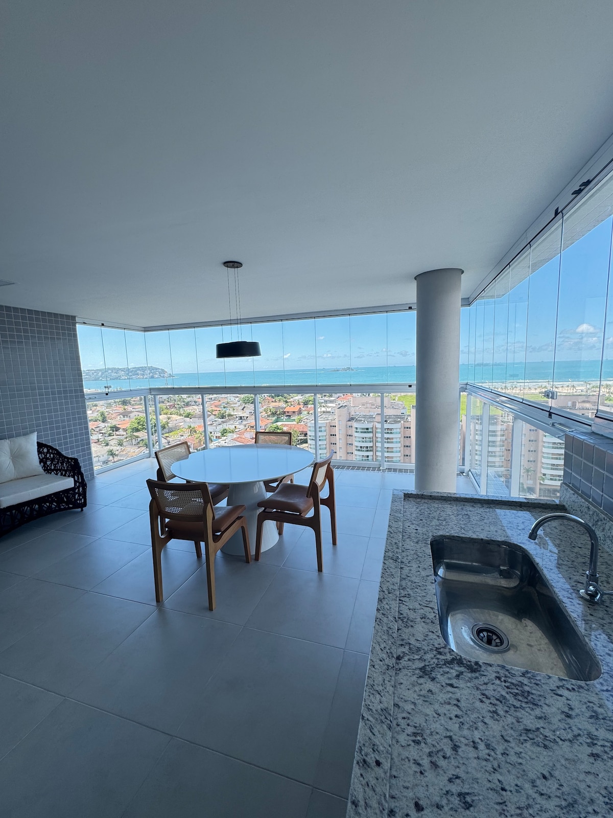 Enjoy the serenity of the seaside in this cozy apartment in Pitangueiras Guarujá. With stunning panoramic views it offers beach service, modern décor, new appliances and kitchenware, and a garage. Relax in the bright living room or on the balcony with the best ocean views. A fully equipped kitchen and a 55-inch smart TV are included. Whether for a family vacation or a romantic getaway this seaside retreat is the perfect choice. Book now and immerse yourself in the beauty of Guarujá's best beach.