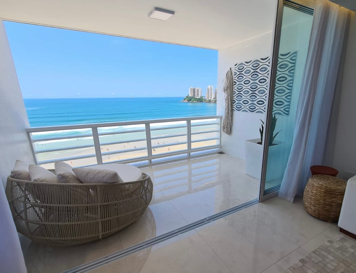 Pé na areia, frente total para o mar com varanda: som das ondas, pássaros, paisagem de tirar o fôlego com vista espetacular. Esse é um apartamento da grife "The Perfect View" -- sempre vistas perfeitas com estilo. A varanda é integrada com uma ampla sala, com vista para o mar. Decorado com design exclusivo oferecendo experiencia única para relaxar ou trabalhar à distância -wi-fi de alta velocidade , ar condic. em todos os cômodos, smart TVs e home office. Uma vaga na garagem com manobrista.