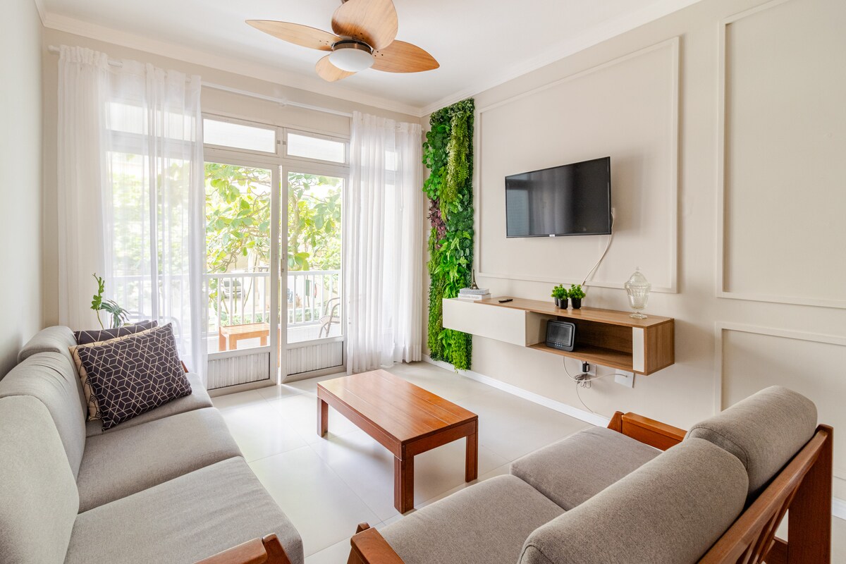 Enjoy the serenity of the seaside in this cozy apartment in Pitangueiras Guarujá. With stunning panoramic views it offers beach service, modern décor, new appliances and kitchenware, and a garage. Relax in the bright living room or on the balcony with the best ocean views. A fully equipped kitchen and a 55-inch smart TV are included. Whether for a family vacation or a romantic getaway this seaside retreat is the perfect choice. Book now and immerse yourself in the beauty of Guarujá's best beach.