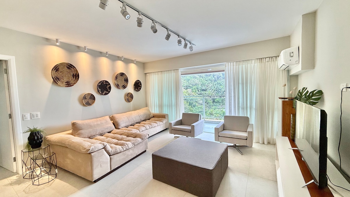 Enjoy the serenity of the seaside in this cozy apartment in Pitangueiras Guarujá. With stunning panoramic views it offers beach service, modern décor, new appliances and kitchenware, and a garage. Relax in the bright living room or on the balcony with the best ocean views. A fully equipped kitchen and a 55-inch smart TV are included. Whether for a family vacation or a romantic getaway this seaside retreat is the perfect choice. Book now and immerse yourself in the beauty of Guarujá's best beach.