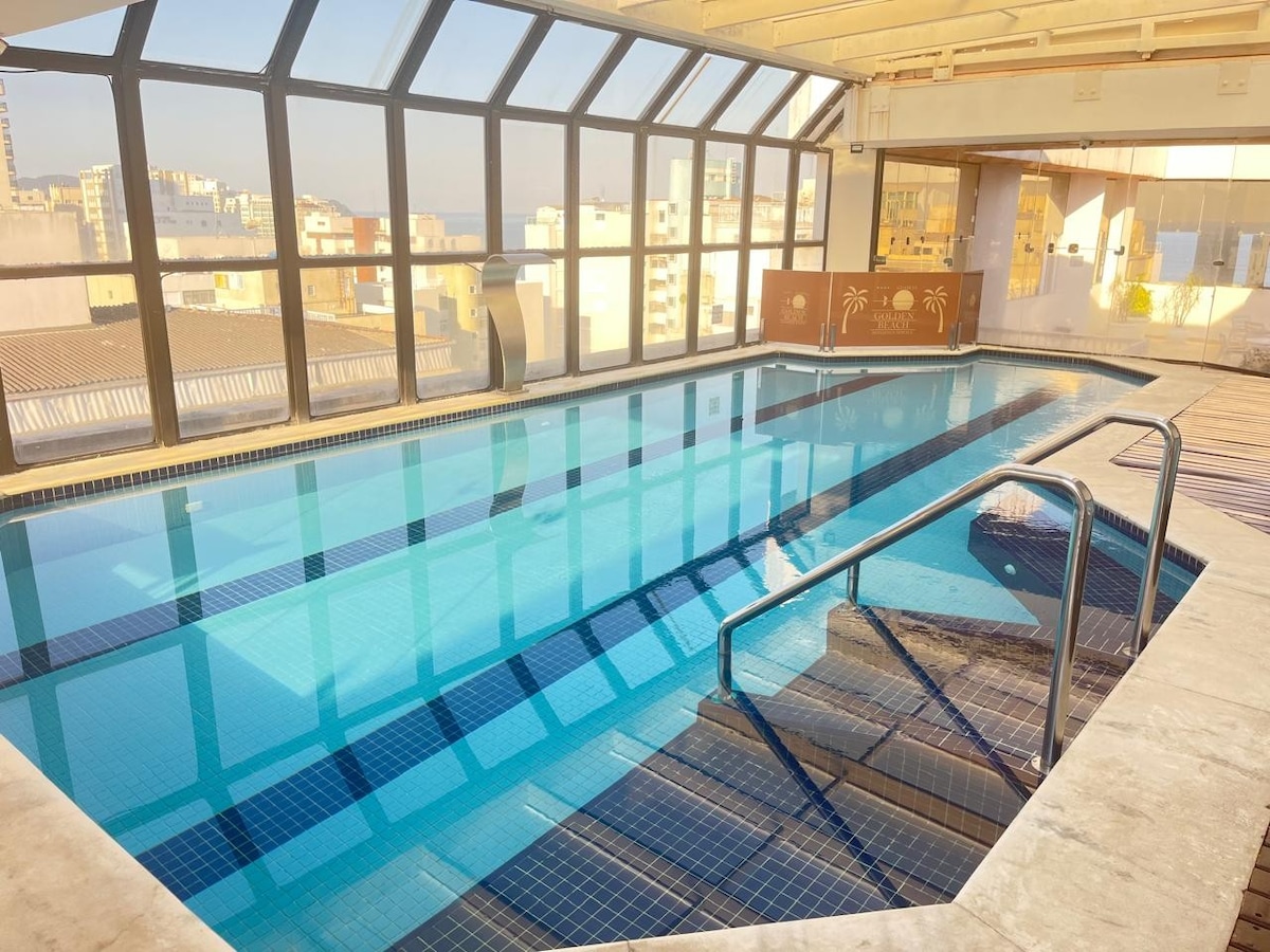 2 Quartos sendo 1 com suíte. Colado na praia de Pitangueiras, uma das mais lindas do Guarujá, a uma quadra da praia, no coração do Centro. Perto: mercado, restaurantes, galerias, sorveterias, cafeterias, McDonald's, BurguerKing, farmácia, SmartFit e na mesma rua o Shopping La Plage. O flat possui: Piscina coberta aquecida, academia, sauna quente e fria, café da manhã(à parte) arrumação diária, mesa de sinuca, ping pong, pebolim, playground, quadra de squash e serviço de praia.