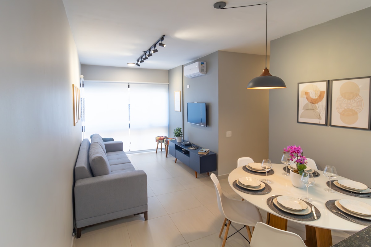 O espaço é ideal para 4 pessoas, possui ar condicionado e ventilador de teto nos ambientes, prático e aconchegante, a 1 quarteirão da praia e ao lado de todo centro comercial, shopping, cinema, bares e restaurantes, você não precisa de veículo para fazer nada.